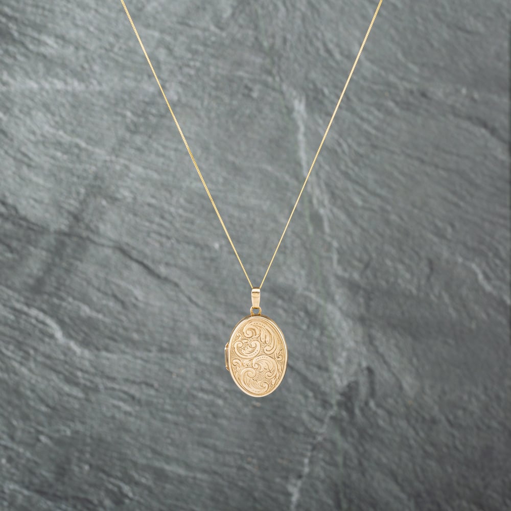 9ct Two Colour Gold Oval Patterned Locket Pendant & 18 Inch Curb Chain