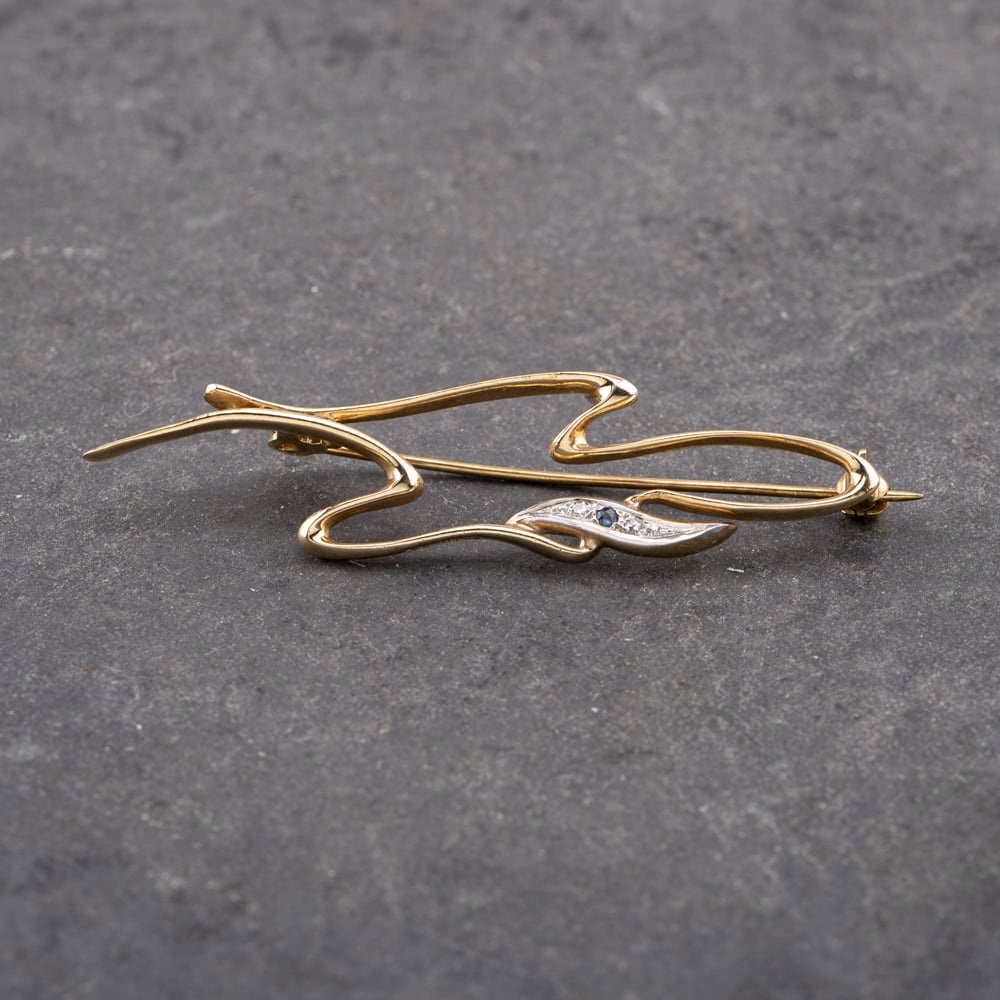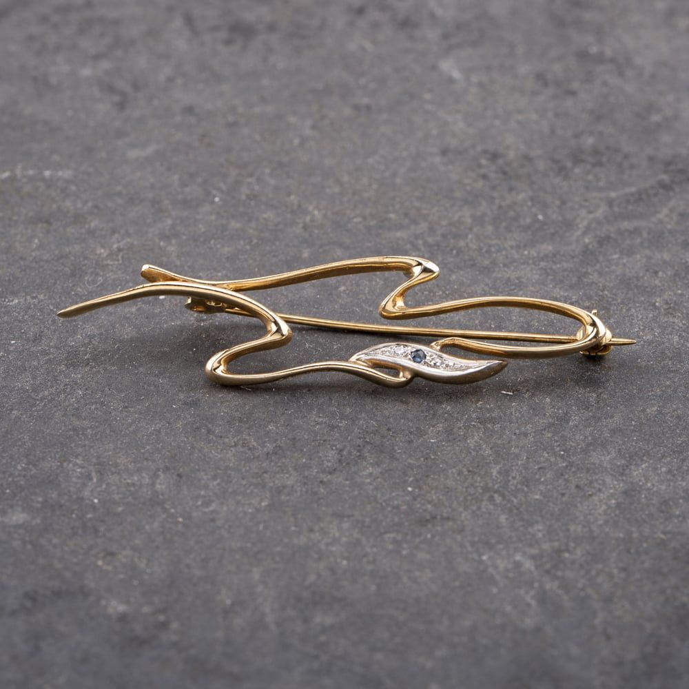 9ct Two Colour Gold Sapphire & Diamond Decorative Ribbon Brooch