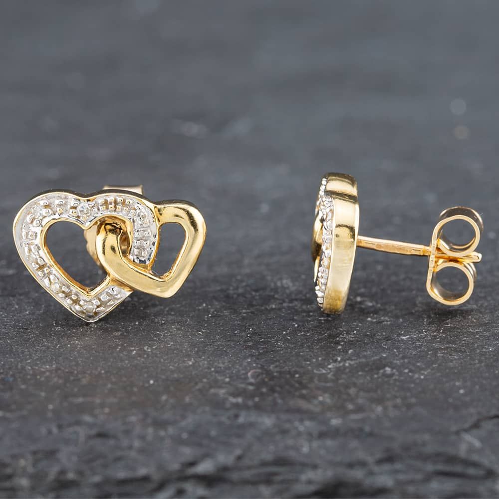 9ct Two Colour Gold Single Cut Diamond Double Heart Stud Earrings
