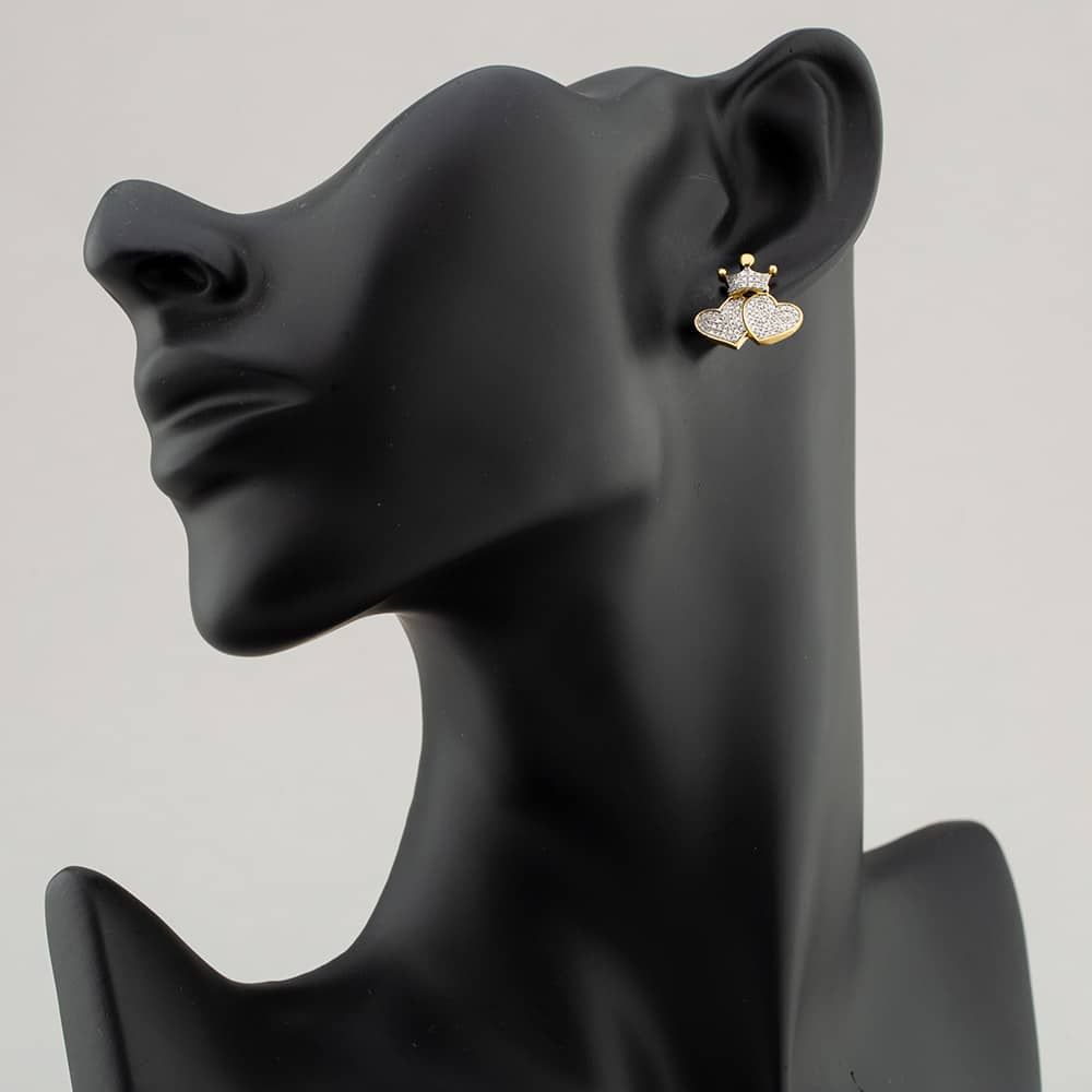 9ct Two Colour Gold Single Cut Diamond Pave Double Heart & Crown Stud Earrings