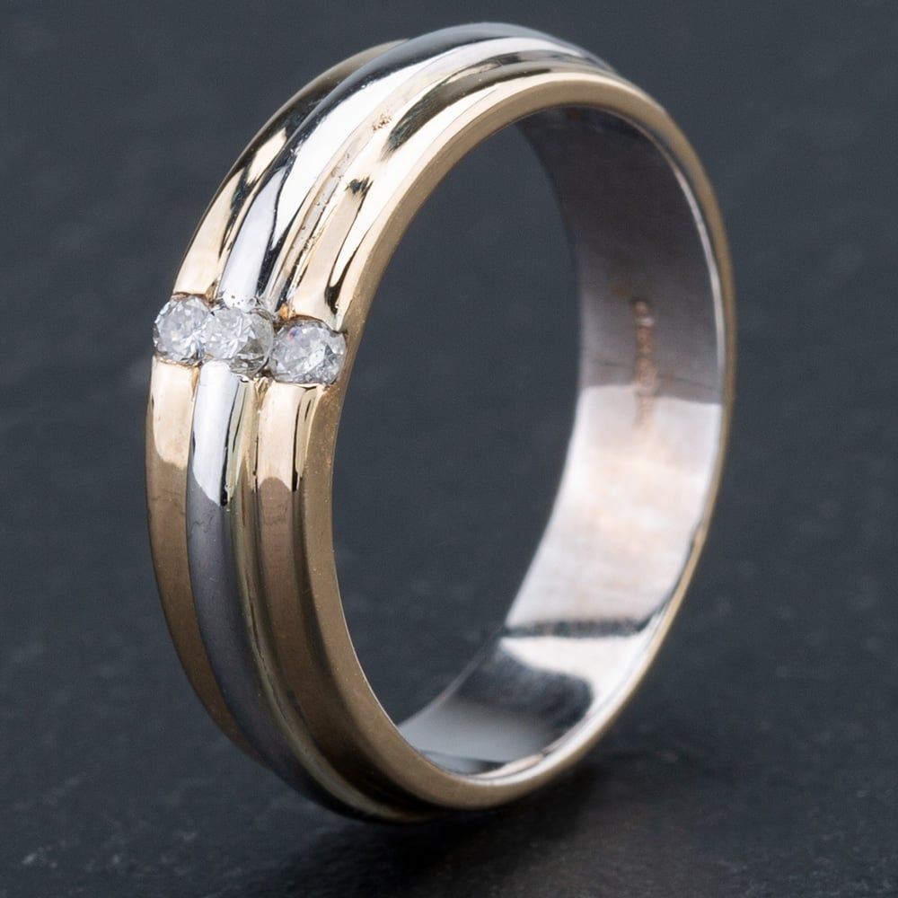 9ct White and Yellow Gold Band Set with 3 Brilliant Cut Diamond 3 Stone Ring Approximate Width Of Ring 5.3mm