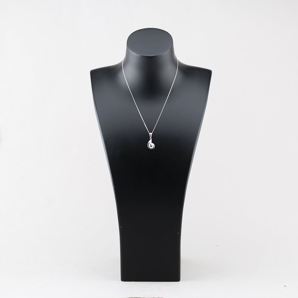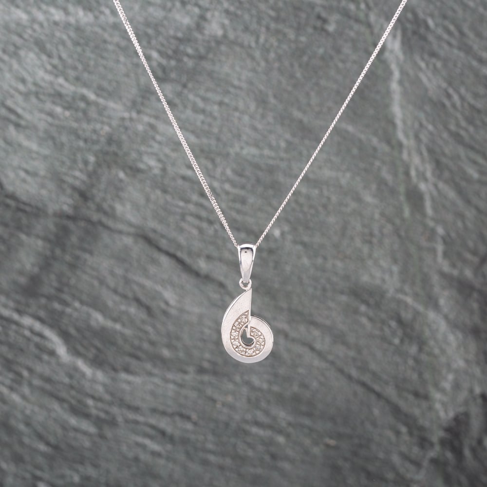 This elegant 9ct white gold pendant features a graceful swirl design accented by a delicate 0.05ct diamond for a subtle, sophisticated sparkle. Suspended from a 16-inch curb chain, its fluid silhouette offers a contemporary twist on classic luxury.