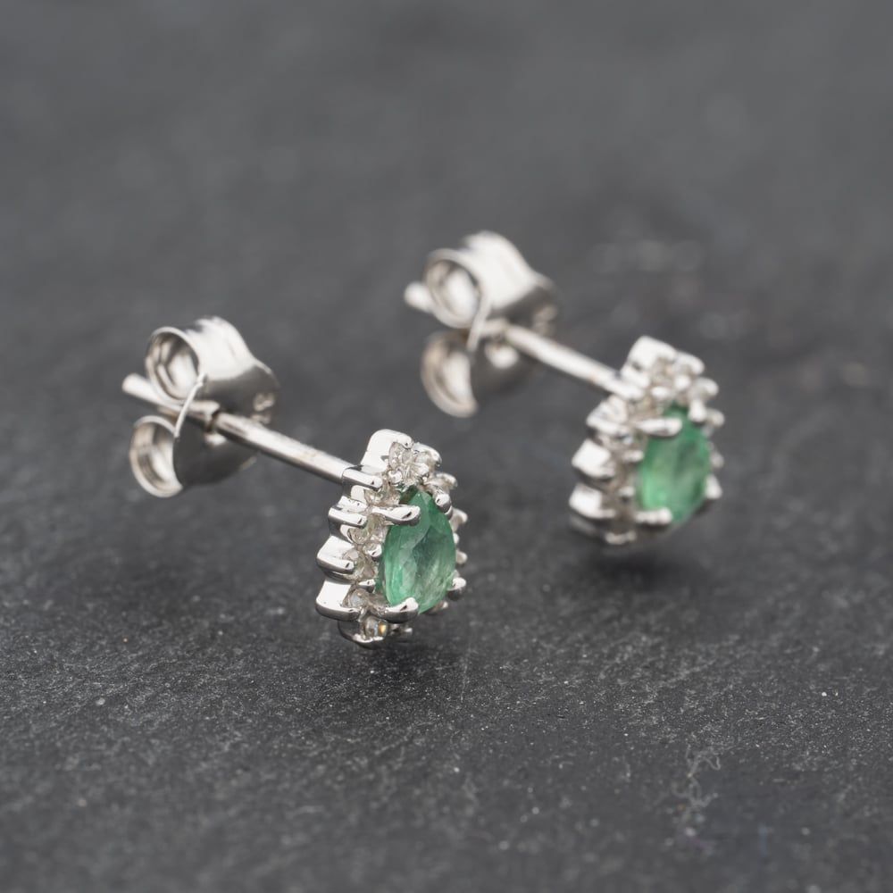 Second Hand 9ct White Gold 0.26ct Emerald & Diamond Teardrop Cluster 7.2mm Stud Earrings 43171285