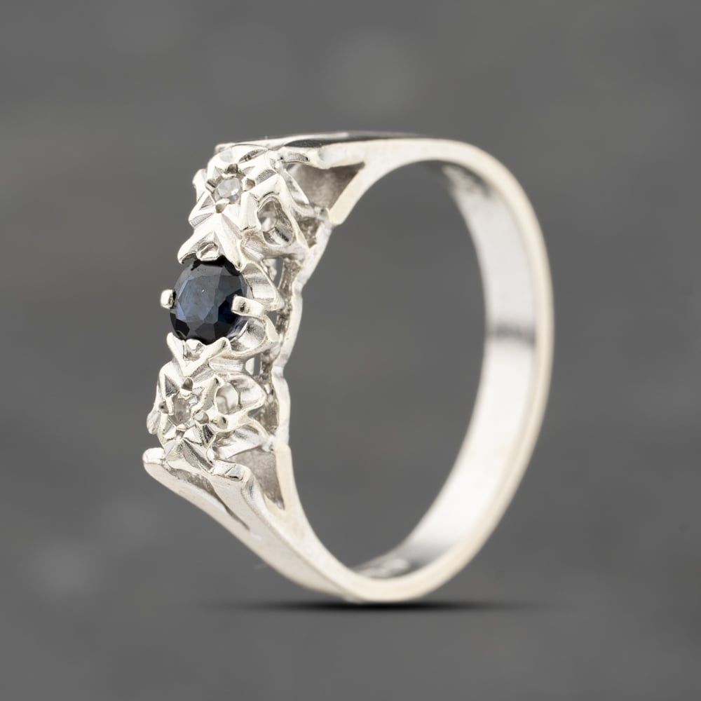 9ct White Gold Diamond & 0.03ct Brilliant Cut Sapphire three Stone Ring