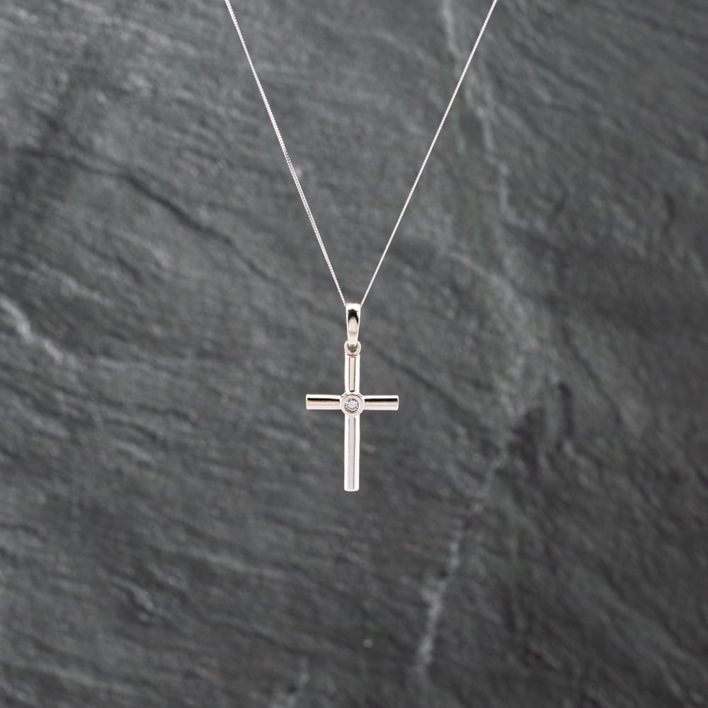 9ct White Gold Diamond Cross Pendant & 18 Inch Curb Chain