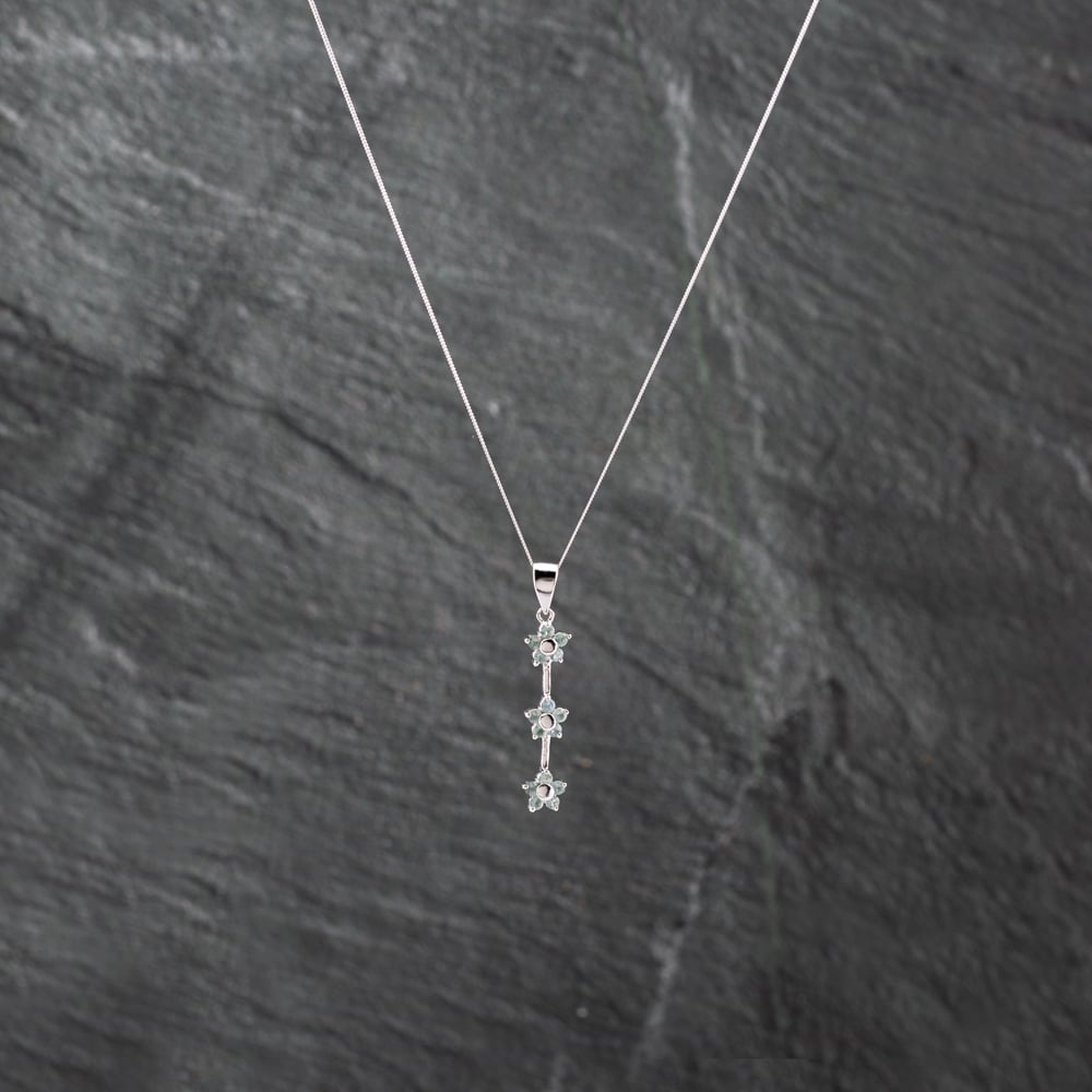 9ct White Gold Pale Green/Blue Topaz Triple Flower Cluster Dropper Pendant & 18 Inch Curb Chain