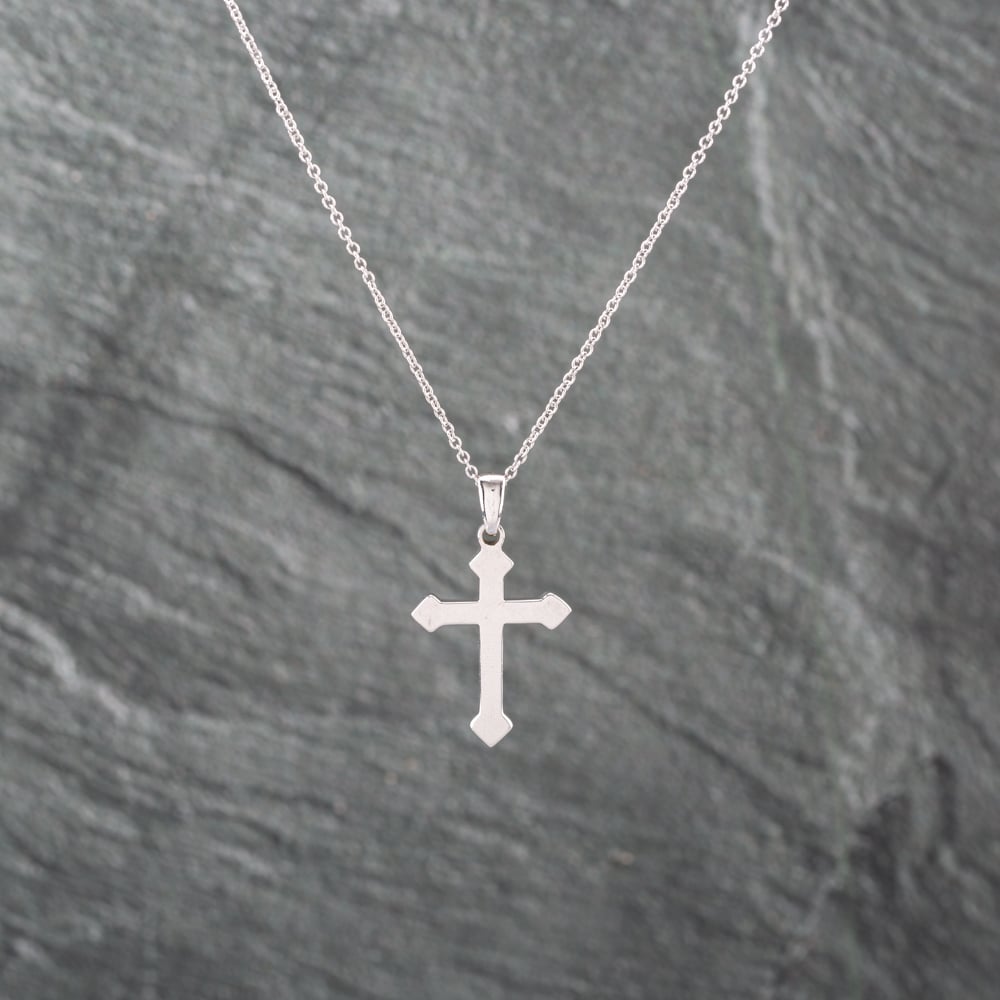 This 9ct white gold cross stands out with its wider 17.2mm profile and elegant 16-inch trace chain, which sits higher on the neckline. Weighing 3.4g, it offers a bright, modern alternative to traditional yellow gold jewellery and features flared edges at the end of each section.