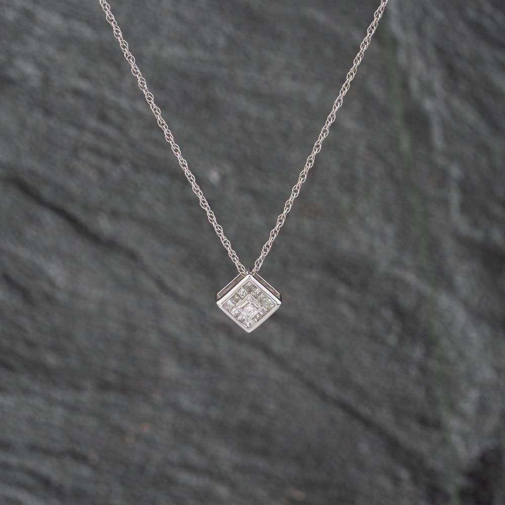 9ct White Gold Princess Cut Diamond Pendant & 18 Inch Prince Of Wales Chain