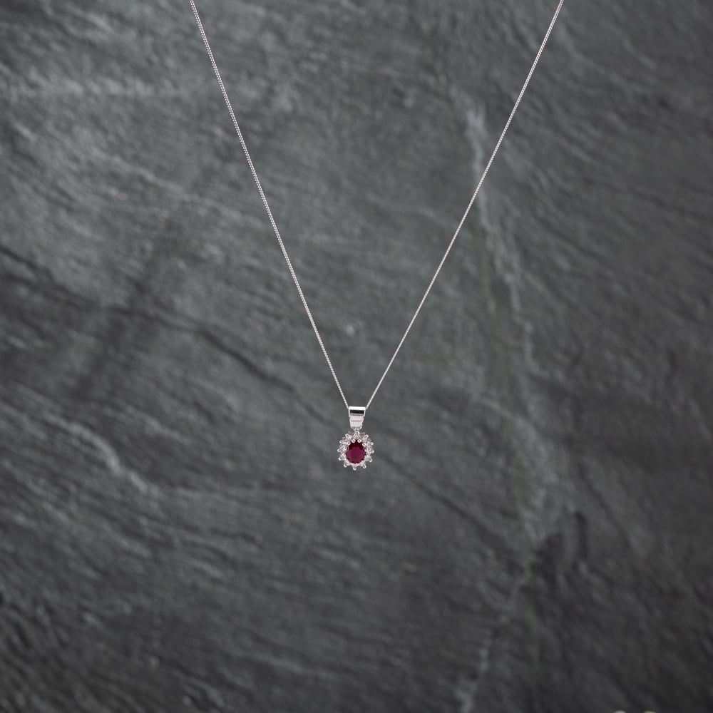 Second Hand 9ct White Gold Ruby & Diamond Oval Cluster Pendant & 18 Inch Curb Chain 41142765 Second Hand 9ct White Gold Ruby & Diamond Oval Cluster Pendant & 18 Inch Curb Chain 41142765