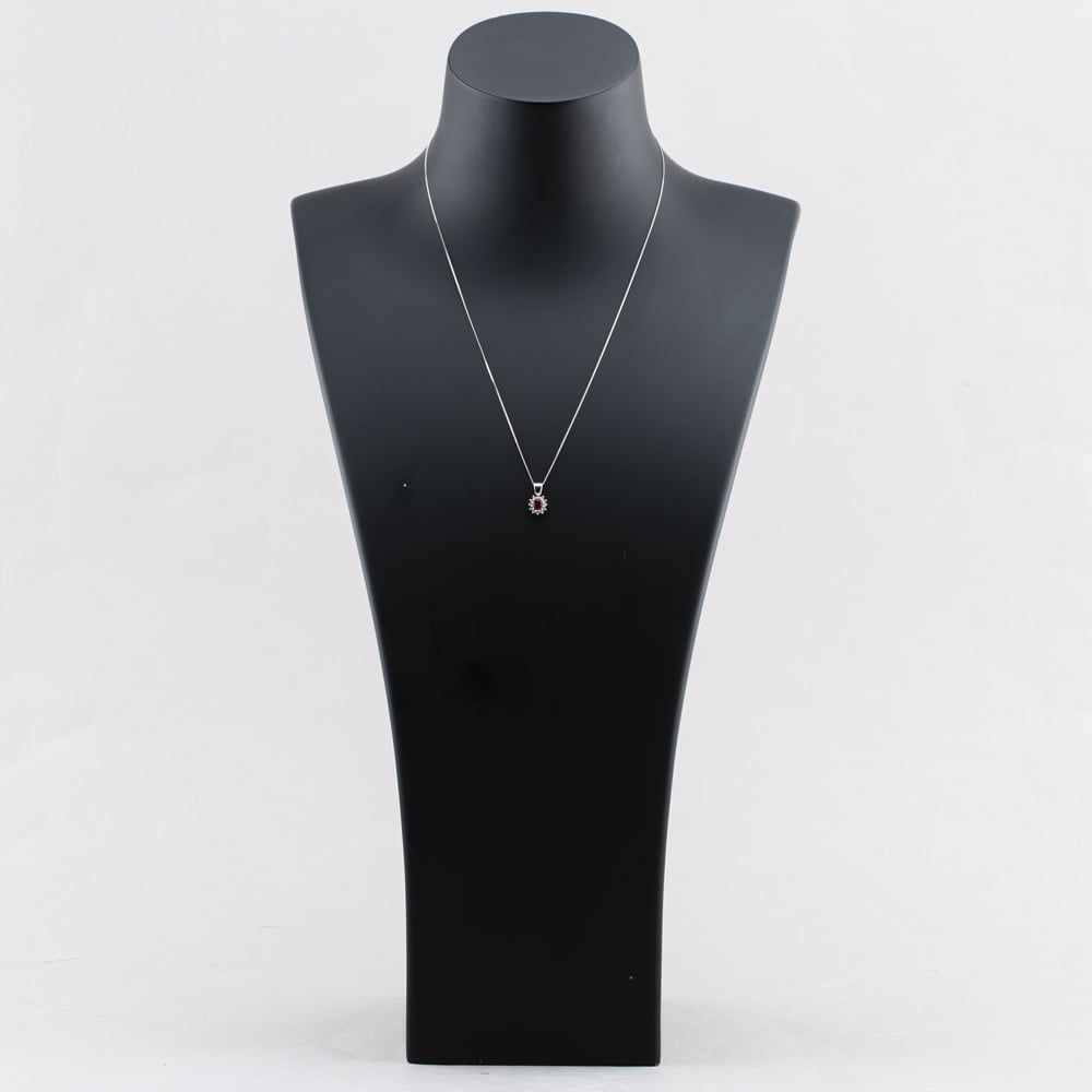 9ct White Gold Ruby & Diamond Oval Cluster Pendant & 18 Inch Curb Chain