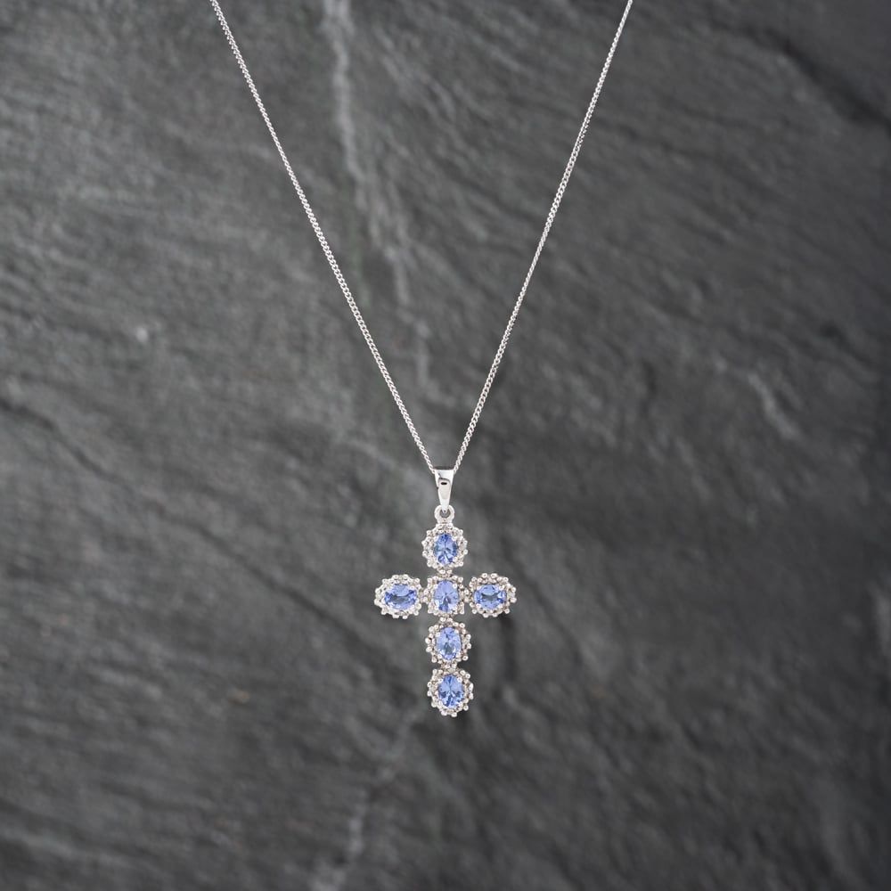 9ct White Gold Tanzanite & 0.20ct Brilliant Cut Diamond Cross Pendant & 18 Inch Curb Chain