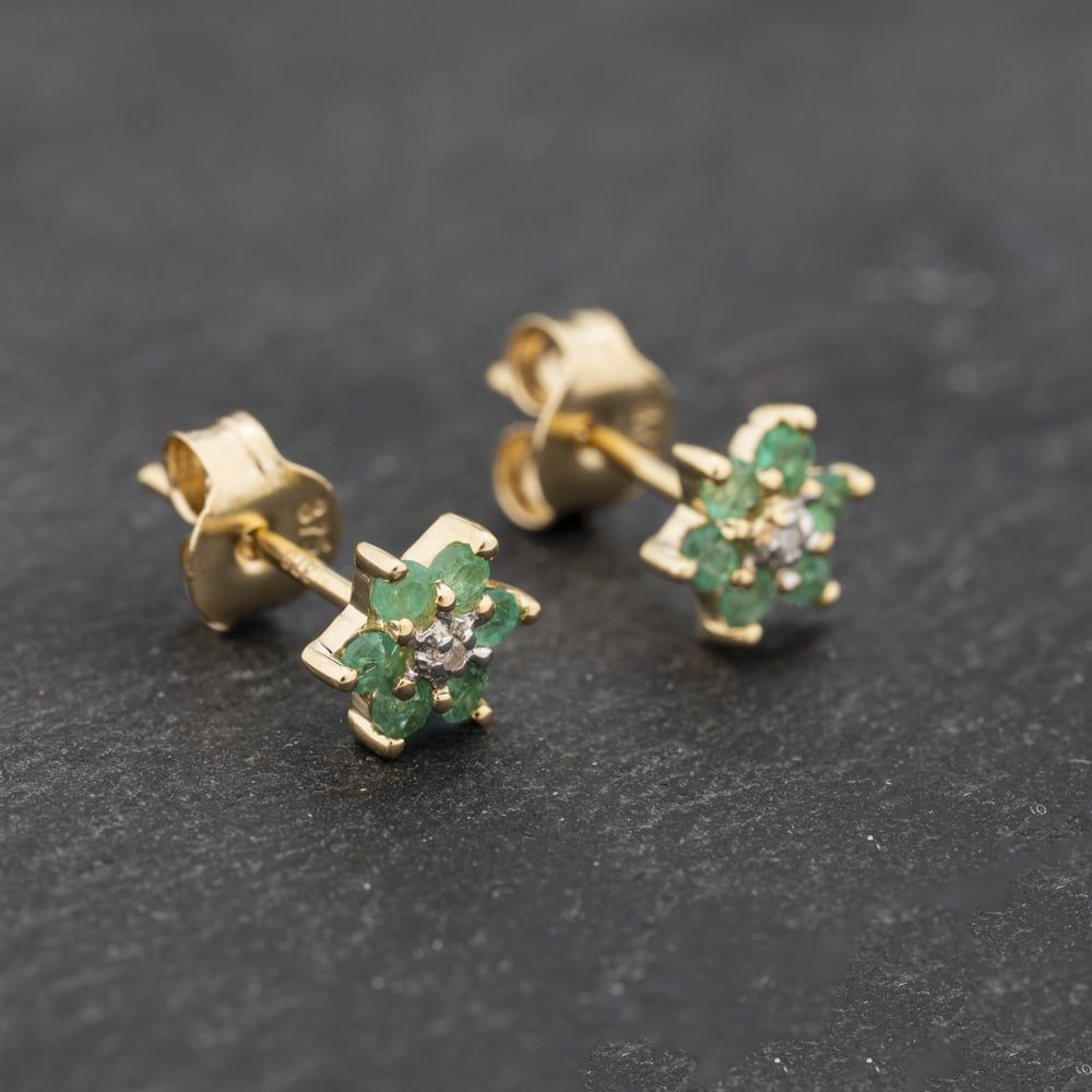Second Hand 9ct Yellow Gold 0.28ct Emerald & Diamond Flower Cluster Stud Earrings 43171301 Second Hand 9ct Yellow Gold 0.28ct Emerald & Diamond Flower Cluster Stud Earrings 43171301