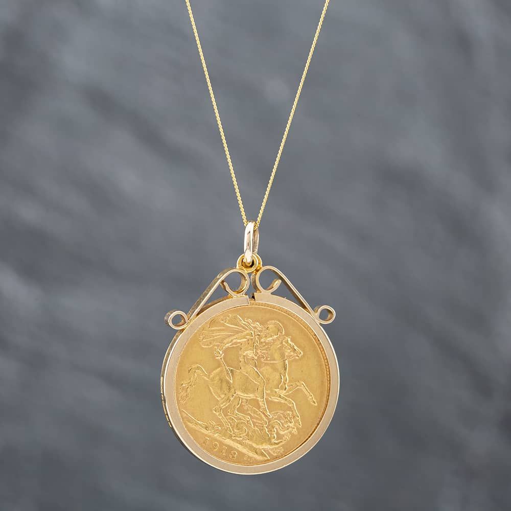 9ct Yellow Gold 1913 Full Sovereign Pendant & 18 Inch Curb Chain