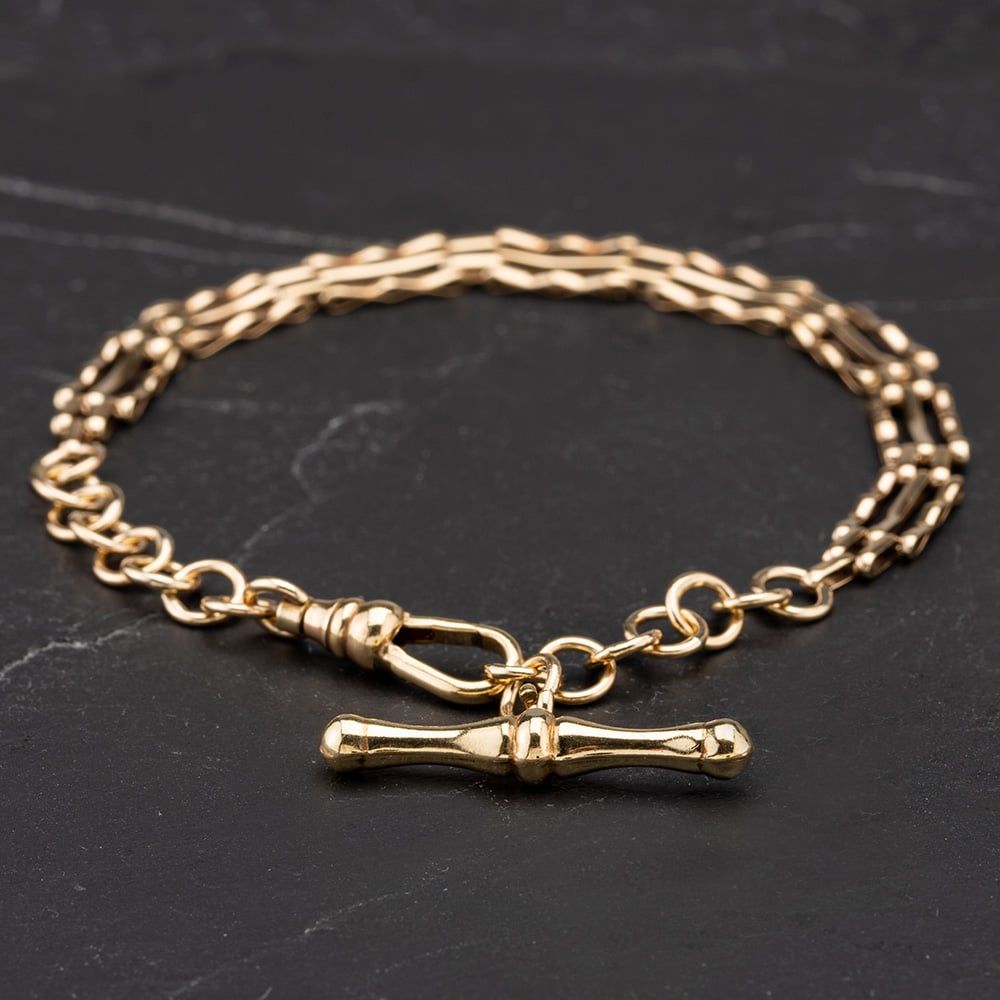 9ct Yellow Gold 7" 3 Bar Gate Bracelet with T-Bar Attached with Fixed Albert Swivel Clasp Approximate Width 5.6mm T-Bar Approximate 26.2mm