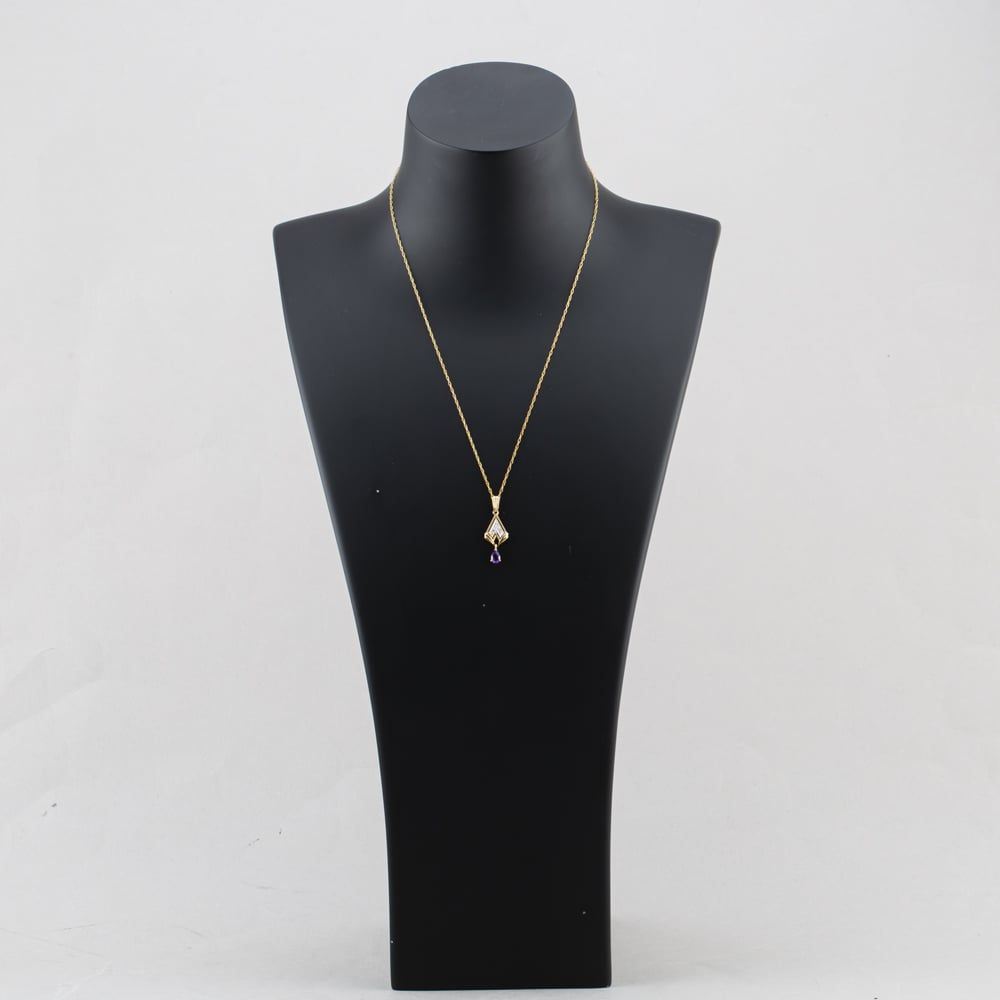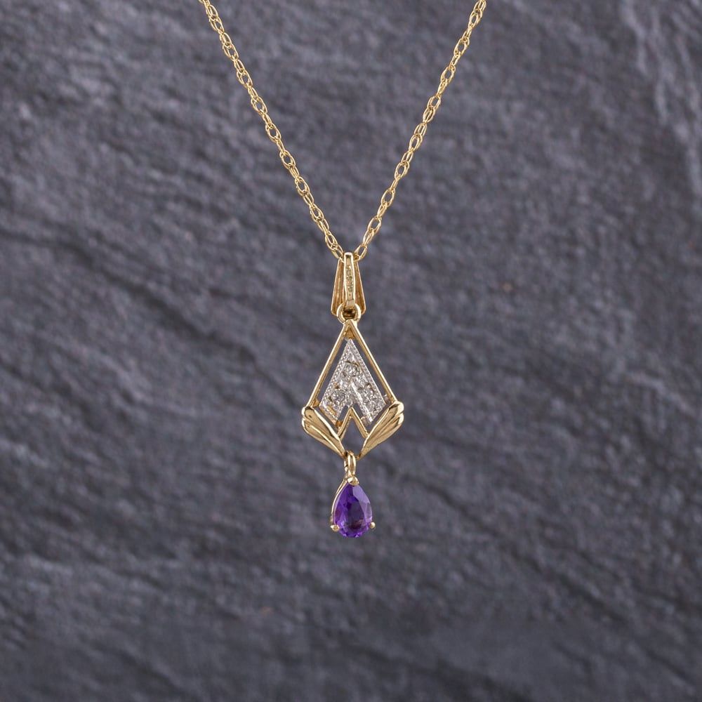 <a href="https://www.thbaker.co.uk/stores/"><b>Click here to find your <font color="6d1a42">nearest store</font></b></a>Second Handhttps://www.thbaker.co.uk/media/catalog/product/4/1/41-14-3189_model_2.jpgadd-to-cartcondition:Yesdisc_no_stock:NoYesNo41143189Second Hand41143189LadiesT H Baker Packaging12 Month WarrantyNoPendant with Chain1.8g18inchPendantPrince of Wales9ct Yellow GoldPurpleAmethystPurple0.03ct{"name":"Klarna","text":"3 payments of \u00a365","imageUrl":"https:\/\/www.thbaker.co.uk\/media\/nosto\/klarna.png"}Second Hand 9ct Yellow Gold Amethyst & 0.03ct Diamond Fan Dropper Pendant & 18 Inch Prince Of Wales Chain41-14-31892026-01-01 00:00:00[{"path":"\/Jewellery\/Gemstone Jewellery","url":"\/gemstone-jewellery\/"},{"path":"\/Jewellery","url":"\/jewellery\/"},{"path":"\/Jewellery\/Gemstone Jewellery\/Amethyst Jewellery","url":"\/amethyst-jewellery\/"},{"path":"\/Jewellery\/Pendants","url":"\/pendants\/"},{"path":"\/Second Hand Collection","url":"\/second-hand\/"},{"path":"\/Second Hand Collection\/Second Hand Jewellery","url":"\/second-hand-jewellery\/"},{"path":"\/Second Hand Collection\/Second Hand Necklaces & Pendants","url":"\/second-hand-necklaces-and-pendants\/"},{"path":"\/Jewellery\/Gold Jewellery","url":"\/gold-jewellery\/"},{"path":"\/Second Hand Collection\/Second Hand Jewellery\/Second Hand Yellow Gold","url":"\/second-hand-yellow-gold-jewellery\/"},{"path":"\/Second Hand Collection\/Second Hand Ladies","url":"\/second-hand-ladies-collection\/"},{"path":"\/Second Hand Collection\/Second Hand Gemstones","url":"\/second-hand-gemstone-jewellery\/"},{"path":"\/Jewellery\/Ladies Jewellery","url":"\/ladies-jewellery\/"},{"path":"\/Second Hand Collection\/Second Hand Necklaces & Pendants\/Second Hand Pendants","url":"\/second-hand-pendants\/"},{"path":"\/Second Hand Collection\/Second Hand Necklaces & Pendants\/Second Hand Necklaces","url":"\/second-hand-necklaces\/"},{"path":"\/Second Hand Collection\/Second Hand Necklaces & Pendants\/Second Hand Gemstone Pendants","url":"\/second-hand-gemstone-pendants\/"},{"path":"\/Jewellery\/Gemstone Jewellery\/Amethyst Jewellery\/Amethyst Pendants","url":"\/amethyst-pendants\/"},{"path":"\/Jewellery\/Gold Jewellery\/Yellow Gold Pendants & Necklaces","url":"\/yellow-gold-pendants\/"},{"path":"\/Jewellery\/Gold Jewellery\/Yellow Gold Pendants & Necklaces\/Yellow Gold Gem Set Pendants","url":"\/yellow-gold-gem-set-pendants\/"},{"path":"\/Second Hand Collection\/Second Hand Gold","url":"\/second-hand-gold\/"},{"path":"\/Second Hand Collection\/Second Hand Jewellery\/Second Hand 9ct","url":"\/second-hand-9ct-jewellery\/"},{"path":"\/Second Hand Collection\/Second Hand Gemstones\/Second Hand Amethyst","url":"\/second-hand-amethyst-jewellery\/"},{"path":"\/Second Hand Collection\/Second Hand Latest Additions","url":"\/second-hand-latest-additions\/"},{"path":"\/Second Hand Collection\/Second Hand Gemstones\/Second Hand Amethyst\/Second Hand Amethyst Pendants","url":"\/second-hand-amethyst-pendants\/"},{"path":"\/Second Hand Collection\/Second Hand Necklaces & Pendants\/Second Hand Ladies Pendants & Necklaces","url":"\/second-hand-ladies-pendants-and-necklaces\/"},{"path":"\/Second Hand Collection\/Second Hand Necklaces & Pendants\/Second Hand Yellow Gold Pendants & Necklaces","url":"\/second-hand-yellow-gold-pendants-and-necklaces\/"}]2026-01-01