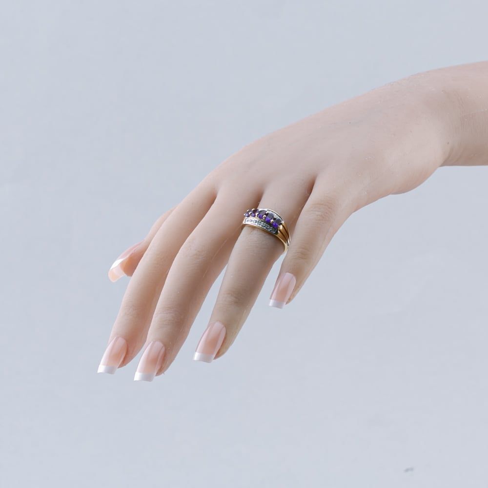 9ct Yellow Gold Amethyst & Diamond three Row Ring