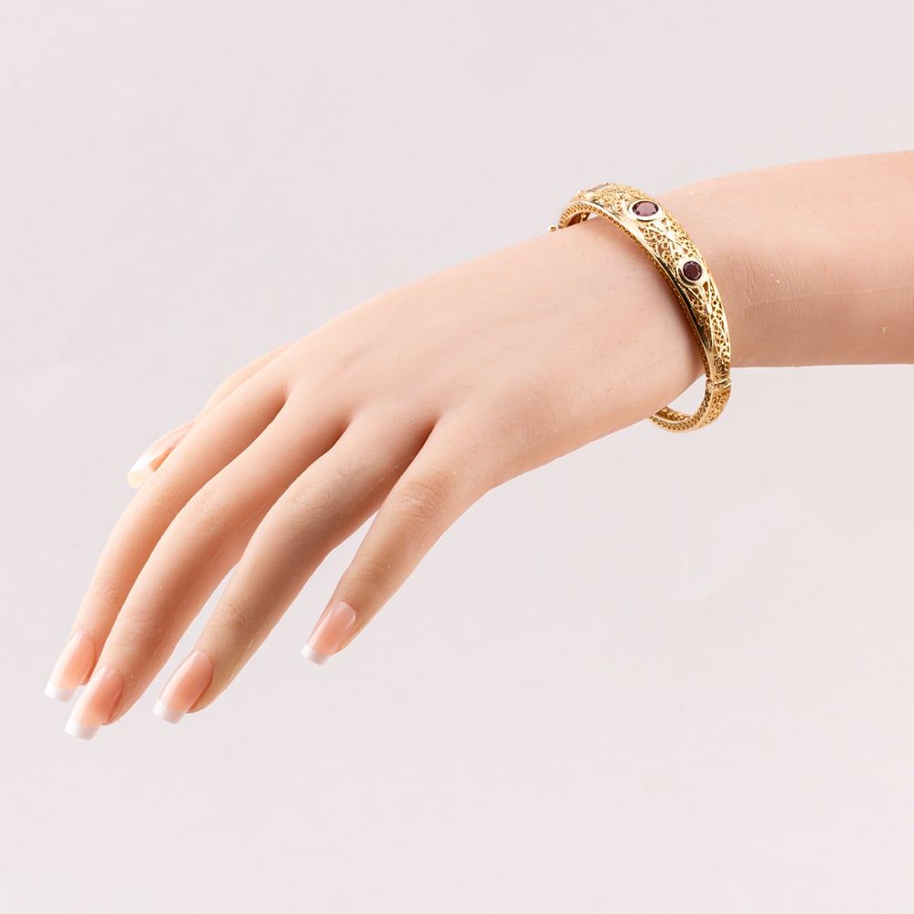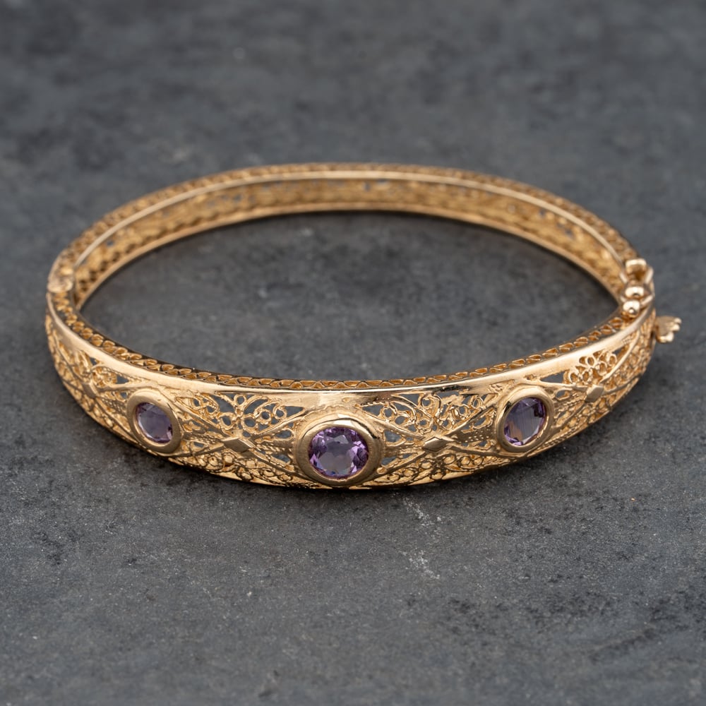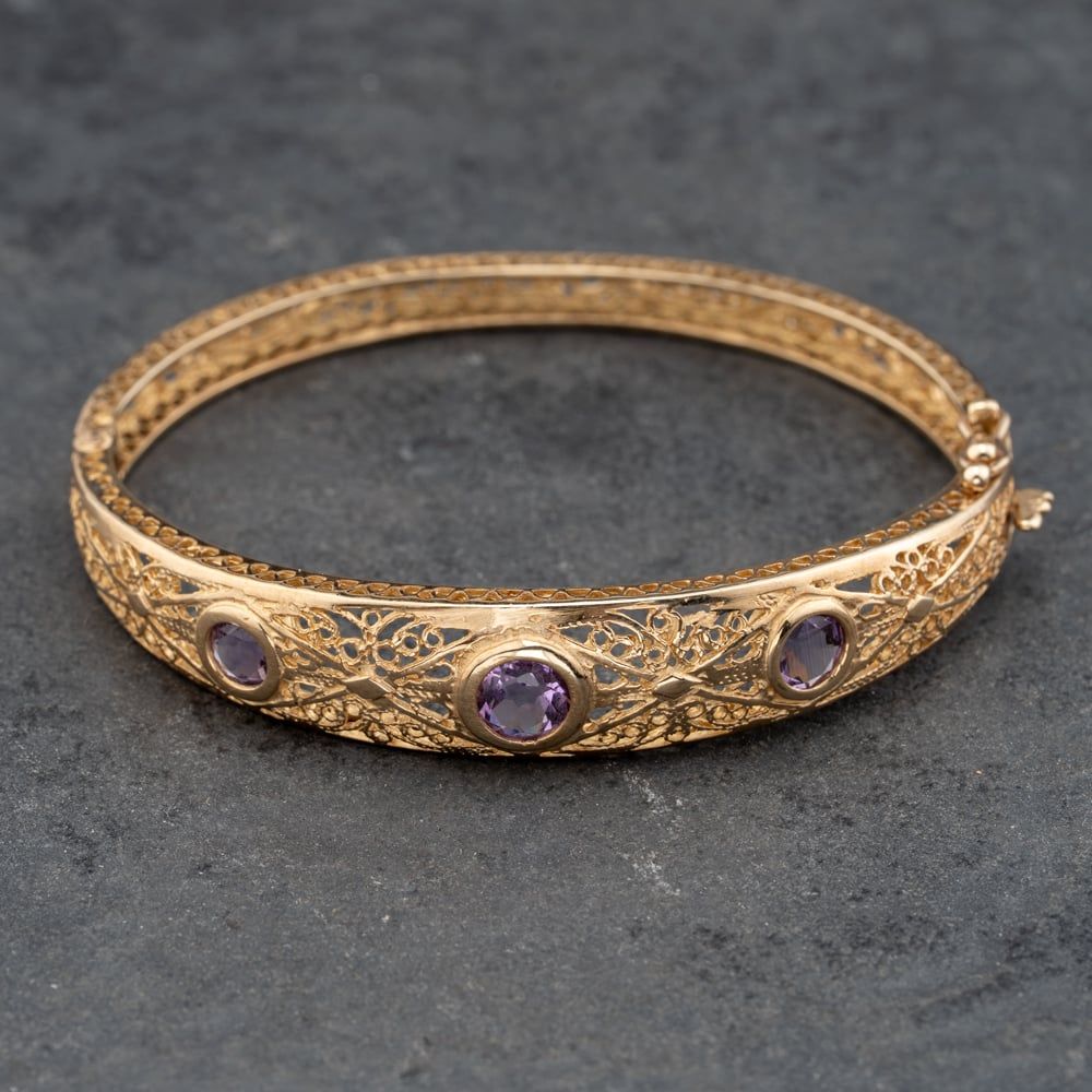 Second Hand 9ct Yellow Gold Amethyst Ornate Openwork Graduating Hinged Bangle 41211366 Second Hand 9ct Yellow Gold Amethyst Ornate Openwork Graduating Hinged Bangle 41211366