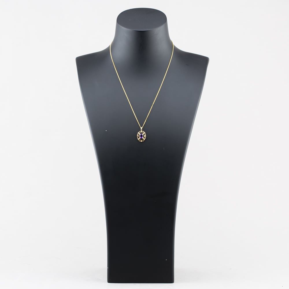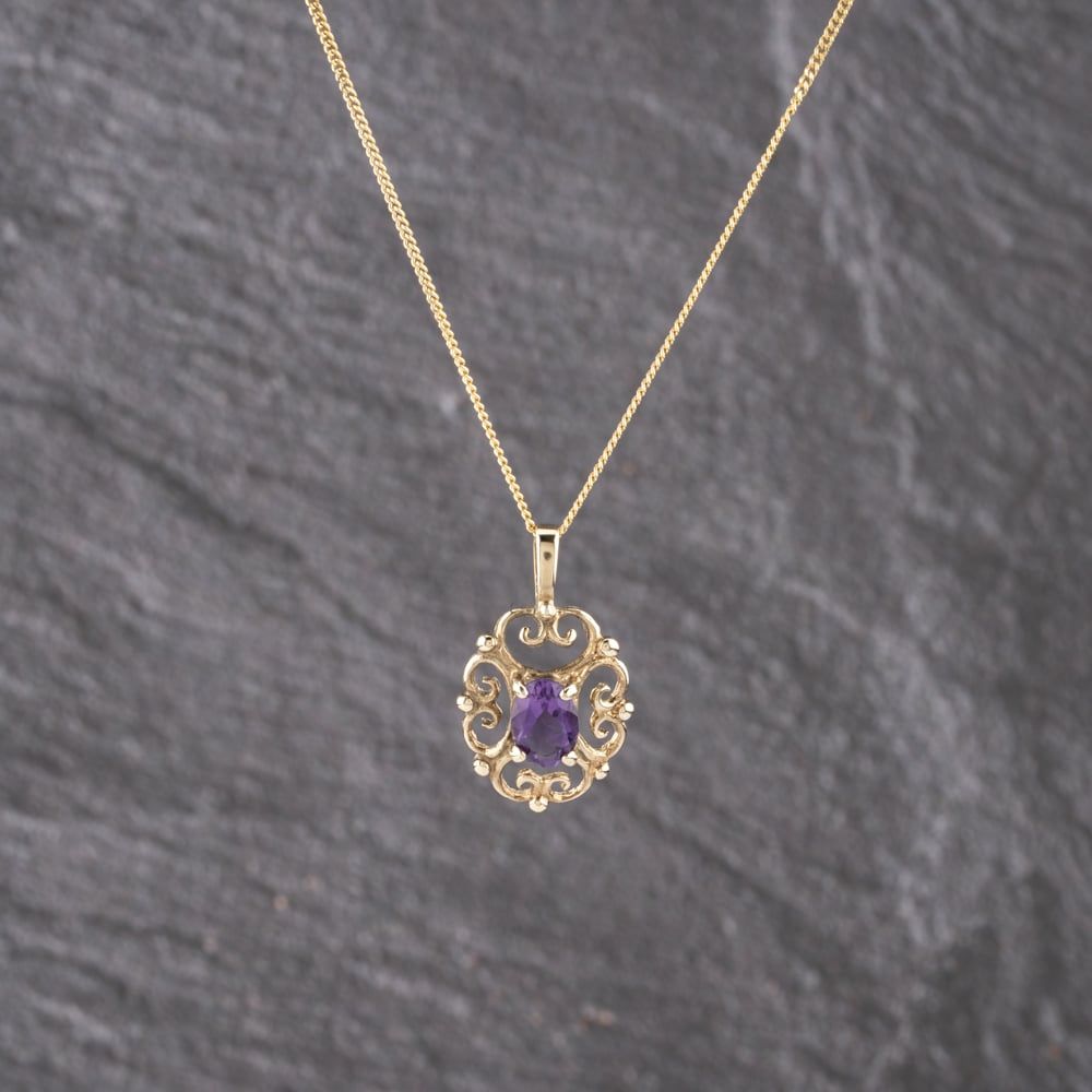 <a href="https://www.thbaker.co.uk/stores/"><b>Click here to find your <font color="6d1a42">nearest store</font></b></a>Second Handhttps://www.thbaker.co.uk/media/catalog/product/4/1/41-14-3161_model_1.jpgadd-to-cartcondition:Yesdisc_no_stock:NoYesNo41143161Second Hand41143161LadiesT H Baker Packaging12 Month WarrantyNoPendant with Chain2.8g17inchPendantCurb9ct Yellow GoldPurpleAmethystPurple{"name":"Klarna","text":"3 payments of \u00a391.67","imageUrl":"https:\/\/www.thbaker.co.uk\/media\/nosto\/klarna.png"}Second Hand 9ct Yellow Gold Amethyst Oval Filigree Pendant & 17 Inch Curb Chain41-14-31612025-12-24 00:00:00[{"path":"\/Jewellery\/Gemstone Jewellery","url":"\/gemstone-jewellery\/"},{"path":"\/Jewellery","url":"\/jewellery\/"},{"path":"\/Seasonal\/Christmas Collection","url":"\/christmas-collection\/"},{"path":"\/Seasonal\/Christmas Collection\/Gifts For Her","url":"\/christmas-gifts-for-her\/"},{"path":"\/Jewellery\/Gemstone Jewellery\/Amethyst Jewellery","url":"\/amethyst-jewellery\/"},{"path":"\/Jewellery\/Pendants","url":"\/pendants\/"},{"path":"\/Second Hand Collection","url":"\/second-hand\/"},{"path":"\/Second Hand Collection\/Second Hand Jewellery","url":"\/second-hand-jewellery\/"},{"path":"\/Second Hand Collection\/Second Hand Necklaces & Pendants","url":"\/second-hand-necklaces-and-pendants\/"},{"path":"\/Jewellery\/Gold Jewellery","url":"\/gold-jewellery\/"},{"path":"\/Second Hand Collection\/Second Hand Jewellery\/Second Hand Yellow Gold","url":"\/second-hand-yellow-gold-jewellery\/"},{"path":"\/Second Hand Collection\/Second Hand Ladies","url":"\/second-hand-ladies-collection\/"},{"path":"\/Second Hand Collection\/Second Hand Gemstones","url":"\/second-hand-gemstone-jewellery\/"},{"path":"\/Jewellery\/Ladies Jewellery","url":"\/ladies-jewellery\/"},{"path":"\/Second Hand Collection\/Second Hand Necklaces & Pendants\/Second Hand Pendants","url":"\/second-hand-pendants\/"},{"path":"\/Second Hand Collection\/Second Hand Necklaces & Pendants\/Second Hand Necklaces","url":"\/second-hand-necklaces\/"},{"path":"\/Second Hand Collection\/Second Hand Necklaces & Pendants\/Second Hand Gemstone Pendants","url":"\/second-hand-gemstone-pendants\/"},{"path":"\/Jewellery\/Gemstone Jewellery\/Amethyst Jewellery\/Amethyst Pendants","url":"\/amethyst-pendants\/"},{"path":"\/Jewellery\/Gold Jewellery\/Yellow Gold Pendants & Necklaces","url":"\/yellow-gold-pendants\/"},{"path":"\/Jewellery\/Gold Jewellery\/Yellow Gold Pendants & Necklaces\/Yellow Gold Gem Set Pendants","url":"\/yellow-gold-gem-set-pendants\/"},{"path":"\/Second Hand Collection\/Second Hand Gold","url":"\/second-hand-gold\/"},{"path":"\/Second Hand Collection\/Second Hand Jewellery\/Second Hand 9ct","url":"\/second-hand-9ct-jewellery\/"},{"path":"\/Second Hand Collection\/Second Hand Gemstones\/Second Hand Amethyst","url":"\/second-hand-amethyst-jewellery\/"},{"path":"\/Second Hand Collection\/Second Hand Gemstones\/Second Hand Amethyst\/Second Hand Amethyst Pendants","url":"\/second-hand-amethyst-pendants\/"},{"path":"\/Second Hand Collection\/Second Hand Necklaces & Pendants\/Second Hand Ladies Pendants & Necklaces","url":"\/second-hand-ladies-pendants-and-necklaces\/"},{"path":"\/Second Hand Collection\/Second Hand Necklaces & Pendants\/Second Hand Yellow Gold Pendants & Necklaces","url":"\/second-hand-yellow-gold-pendants-and-necklaces\/"},{"path":"\/Seasonal\/Christmas Collection\/Pre Loved Christmas Gifts","url":"\/pre-loved-christmas-gifts\/"},{"path":"\/Free Gift","url":"\/free-gift\/"}]2026-03-24