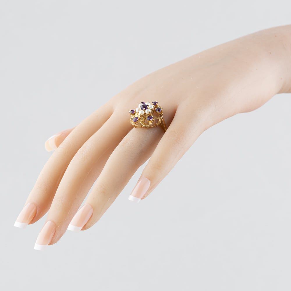 9ct Yellow Gold Amethyst & Seed Pearl Openwork Cluster Ring