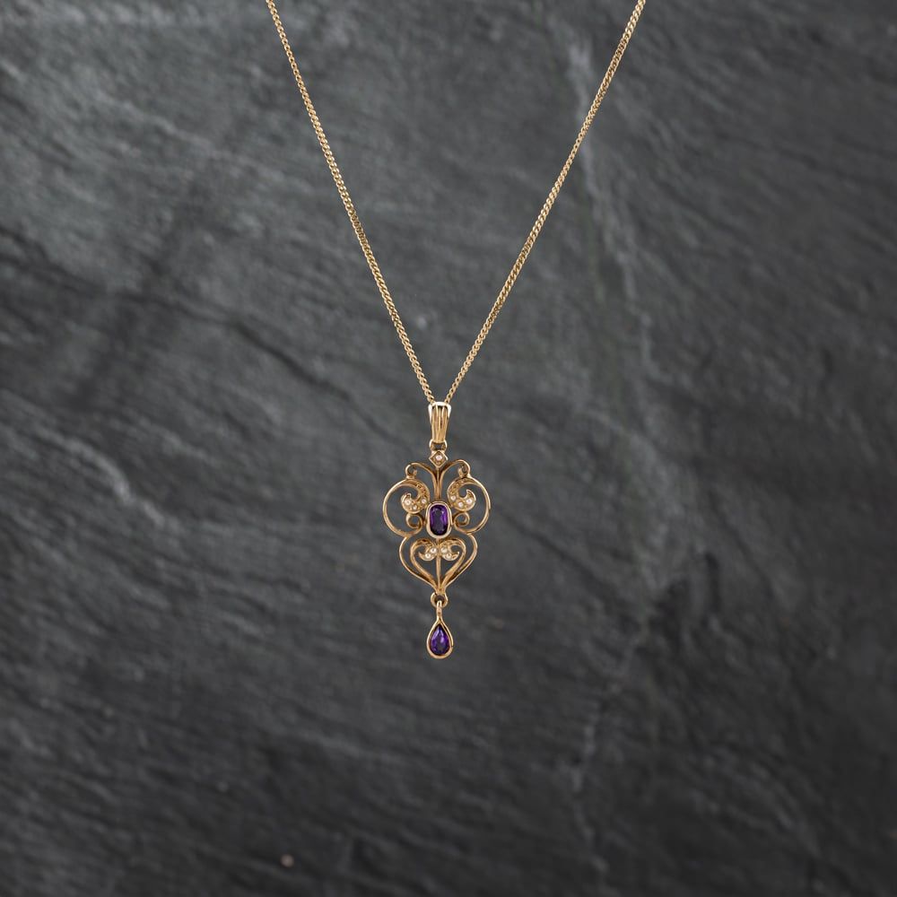 Second Hand 9ct Yellow Gold Amethyst & Seed Pearl Scrolling Openwork Design Pendant & 18 Inch Curb Chain 41142769 Second Hand 9ct Yellow Gold Amethyst & Seed Pearl Scrolling Openwork Design Pendant & 18 Inch Curb Chain 41142769