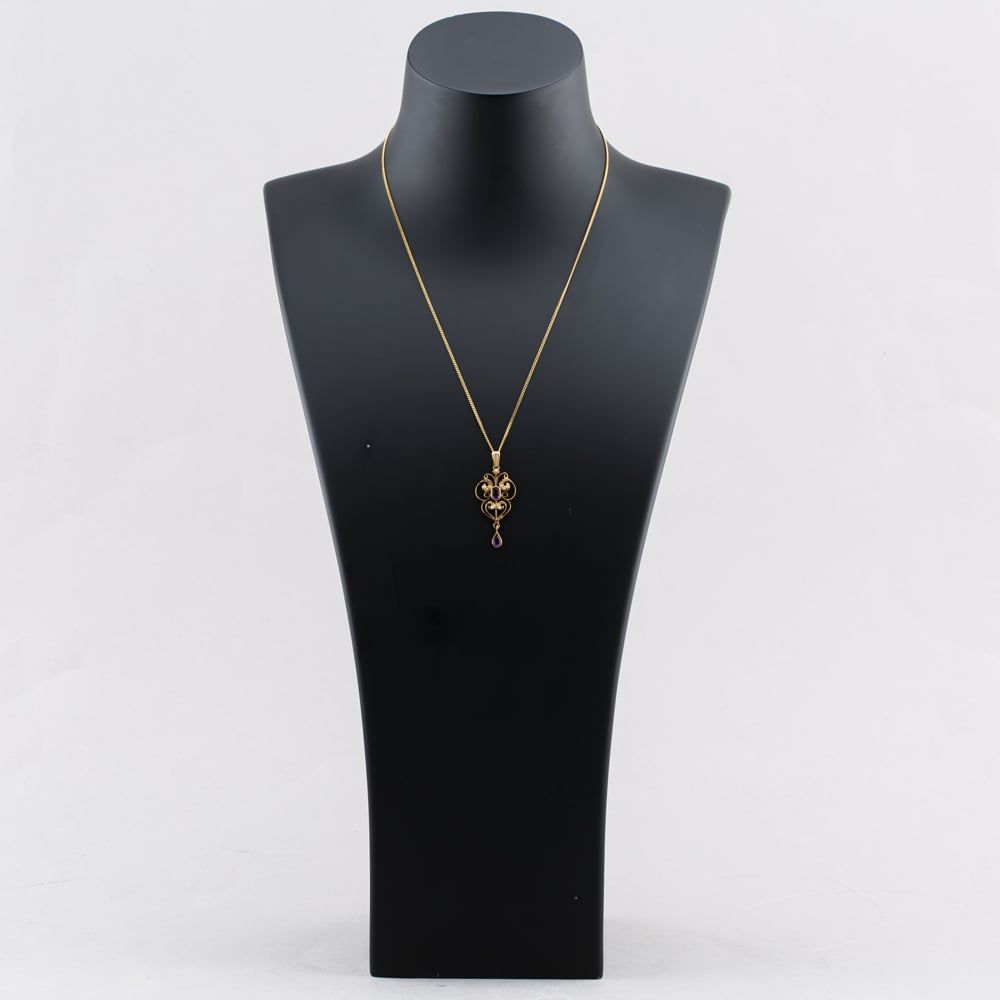 Second Hand 9ct Yellow Gold Amethyst & Seed Pearl Scrolling Openwork Design Pendant & 18 Inch Curb Chain 41142769