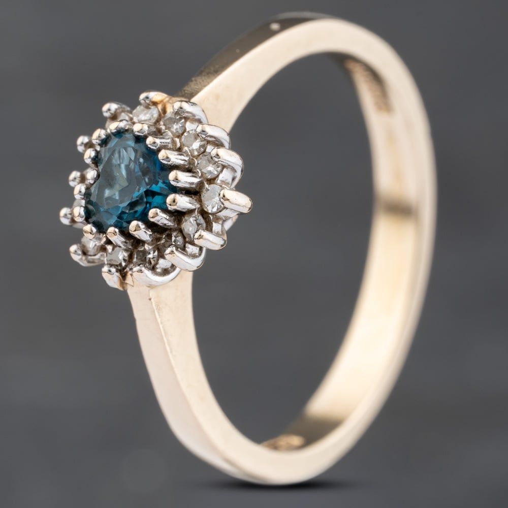 9ct Yellow Gold Blue Topaz & 0.14ct Diamond Heart Shape Cluster Ring