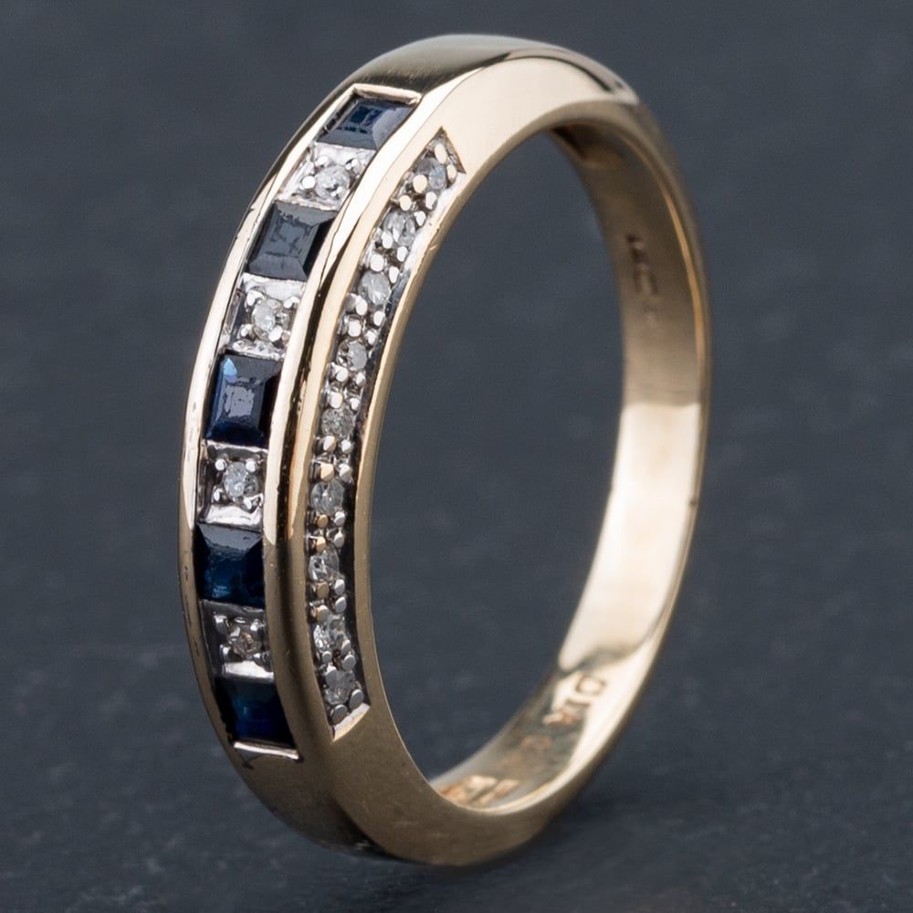 9ct Yellow Gold Brilliant Cut Diamond and Square Cut Sapphire Half Eternity Ring with Diamond Set Sides