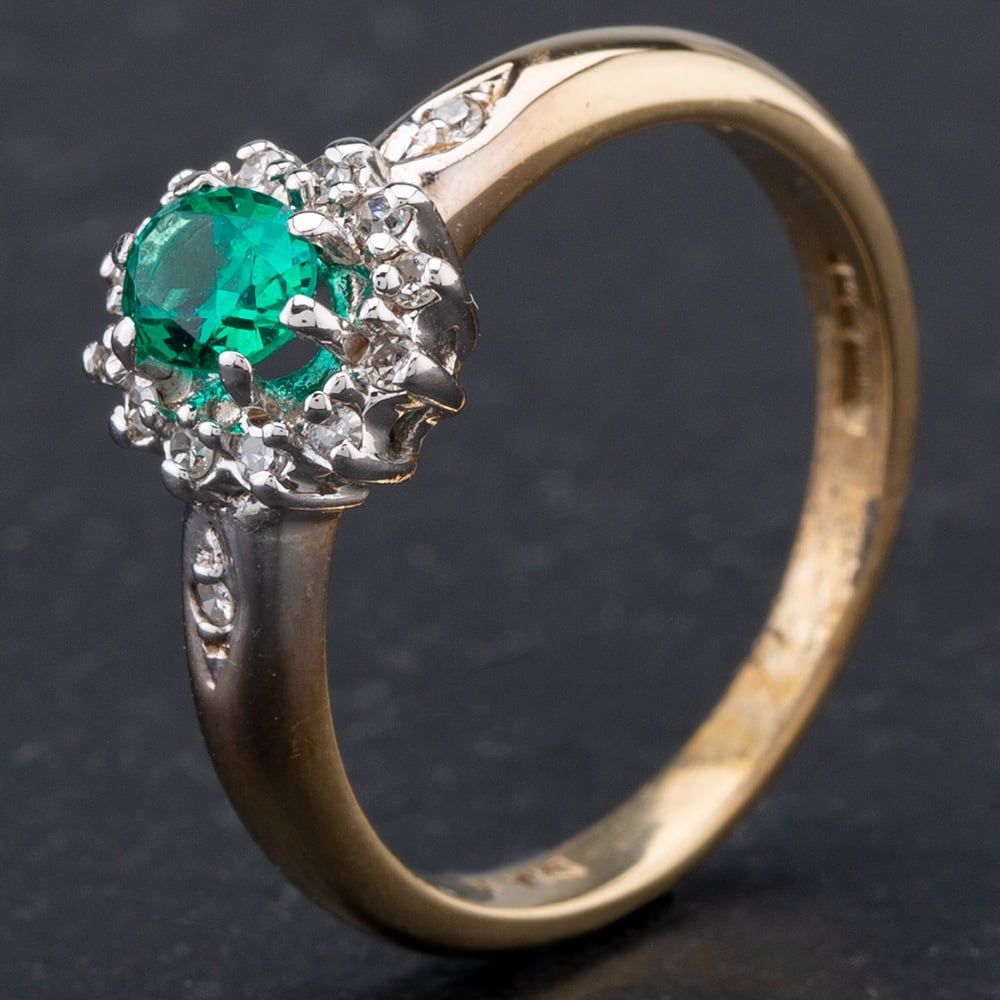 9ct Yellow Gold Brilliant Cut Diamond and Synthetic Emerald Cluster with Diamond Set Shoulders Ring
