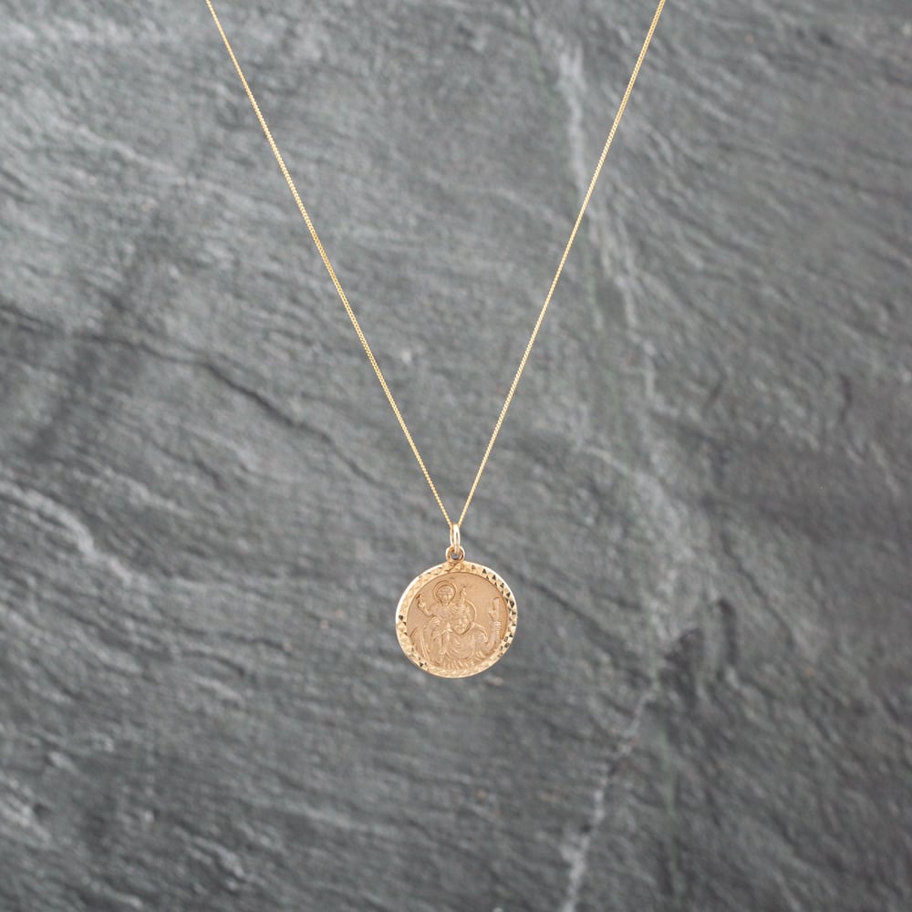 Second Hand 9ct Yellow Gold Circular Diamond Cut Edged St Christopher Pendant & 18 Inch Curb Chain 41142953 Second Hand 9ct Yellow Gold Circular Diamond Cut Edged St Christopher Pendant & 18 Inch Curb Chain 41142953