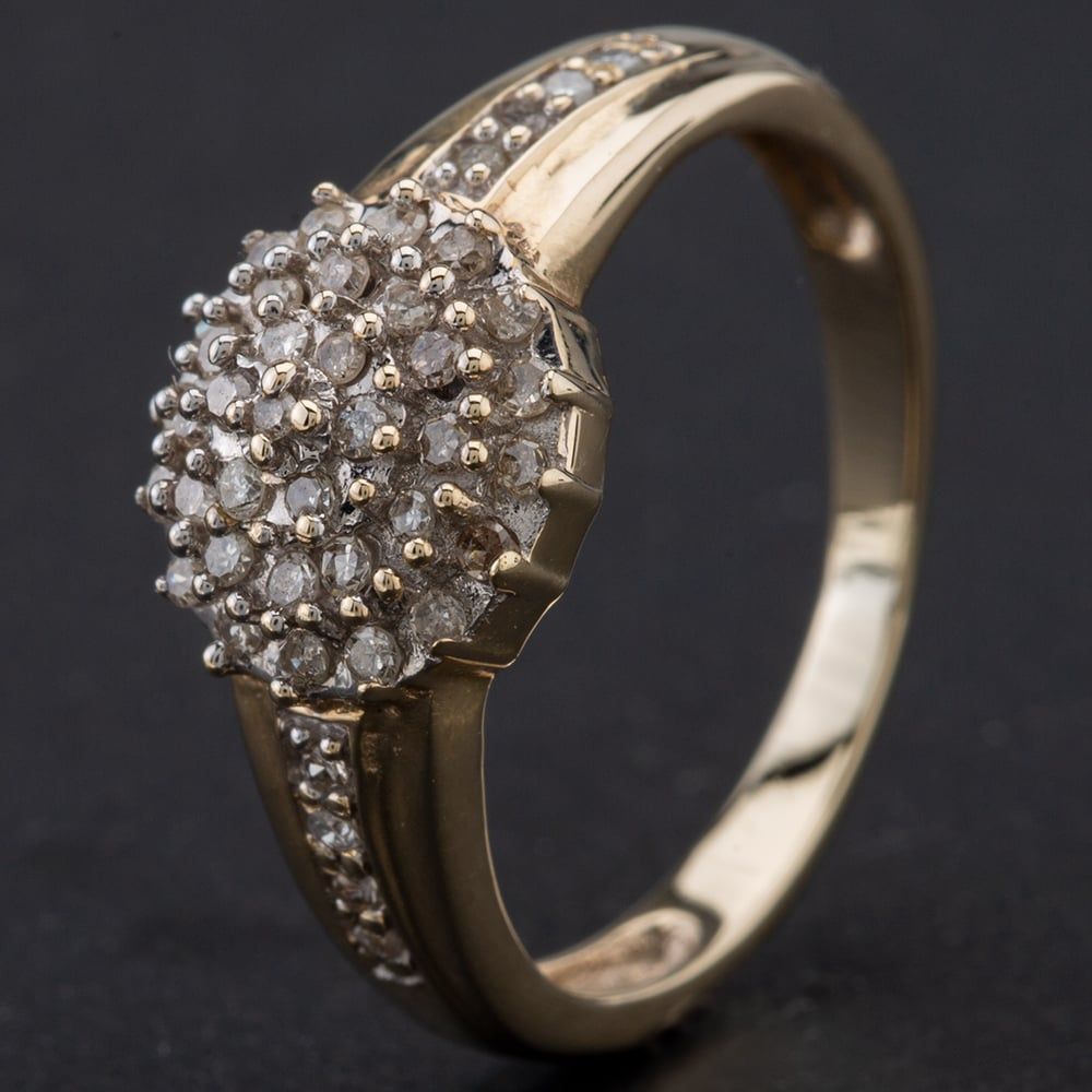 9ct Yellow Gold Claw Set Diamond Triple Row Round Cluster Ring with 4 Diamonds Set On Each Shoulder