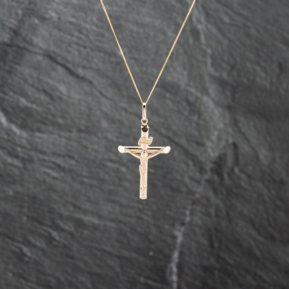 9ct Yellow Gold Crucifix Cross Pendant & 18 Inch Curb Chain
