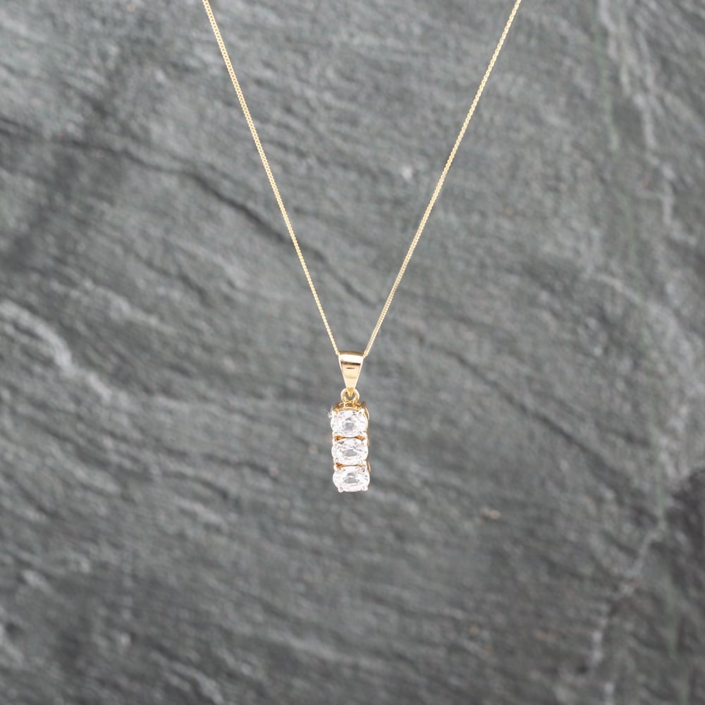 Second Hand 9ct Yellow Gold Cubic Zirconia 3 Stone Dropper Pendant & 18 Inch Curb Chain 41143027 Second Hand 9ct Yellow Gold Cubic Zirconia 3 Stone Dropper Pendant & 18 Inch Curb Chain 41143027