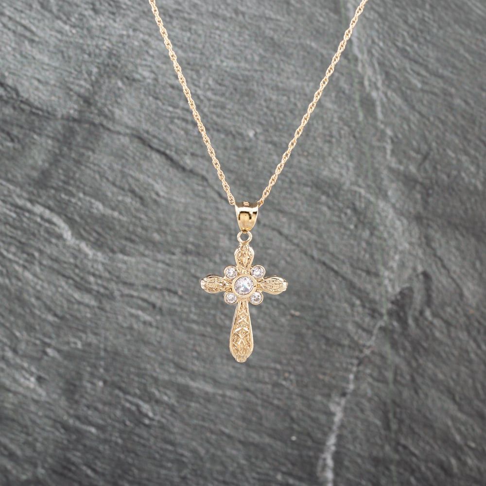 9ct Yellow Gold Cubic Zirconia Ornate Patterned Cross Pendant & 18 Inch Prince Of Wales Chain