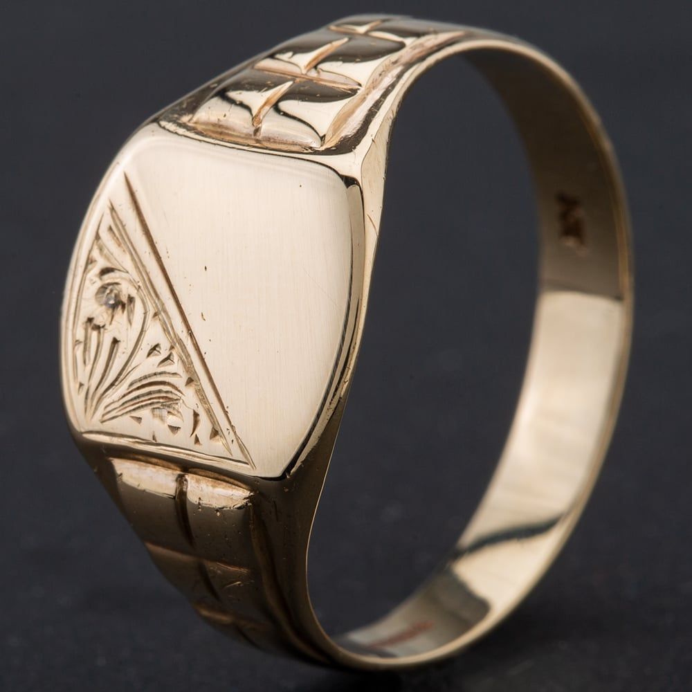 9ct Yellow Gold Gentleman's Cushion Shape Half Engraved Signet Ring