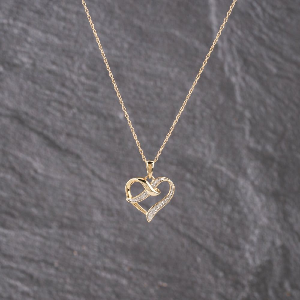 9ct Yellow Gold Diamond Openwork Ribbon Heart Pendant & 18 Inch Prince Of Wales Chain