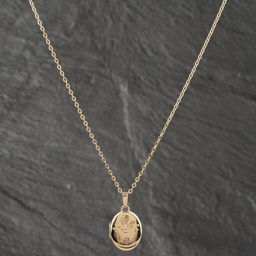 9ct Yellow Gold Diamond Oval Engraved Locket Pendant & 18 Inch Trace Chain
