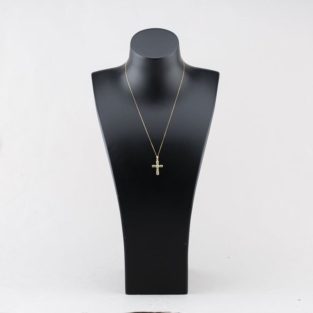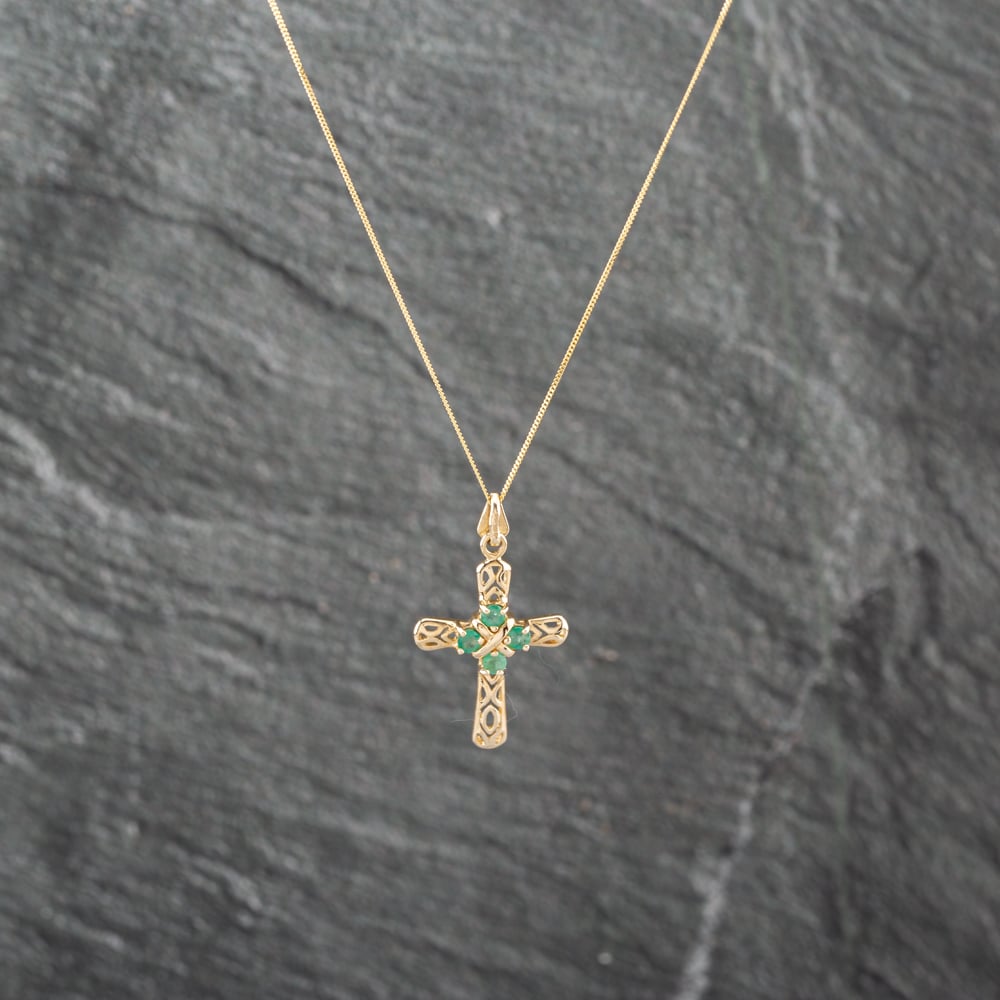 Add a touch of vibrant colour to your collection with this 9ct yellow gold cross set with vivid green emeralds. The fancy 29.2mm design weighs 2.1g and is elegantly presented on a matching 18-inch curb chain.