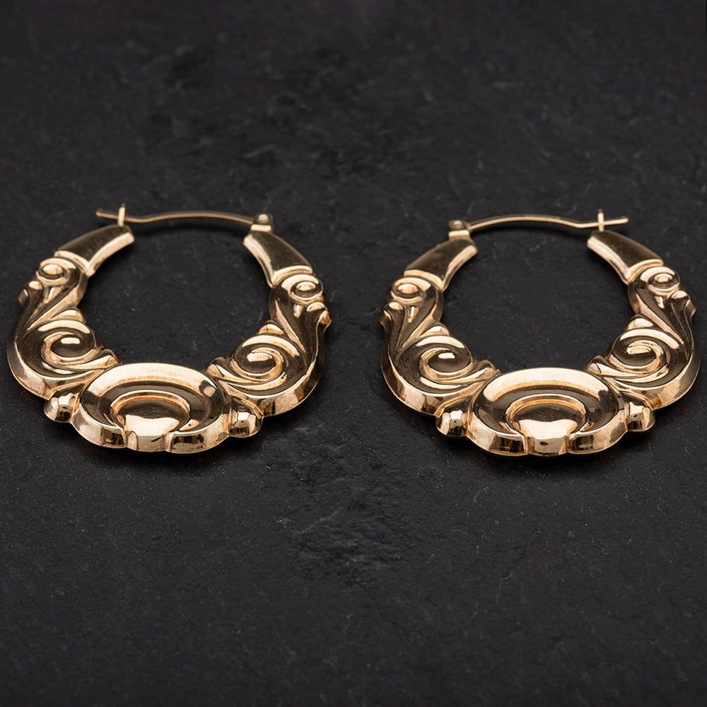 9ct Yellow Gold Fancy Swirls Design Hoop Earrings Approximately 31mm Hinged Lever Fitting Secured In Clip