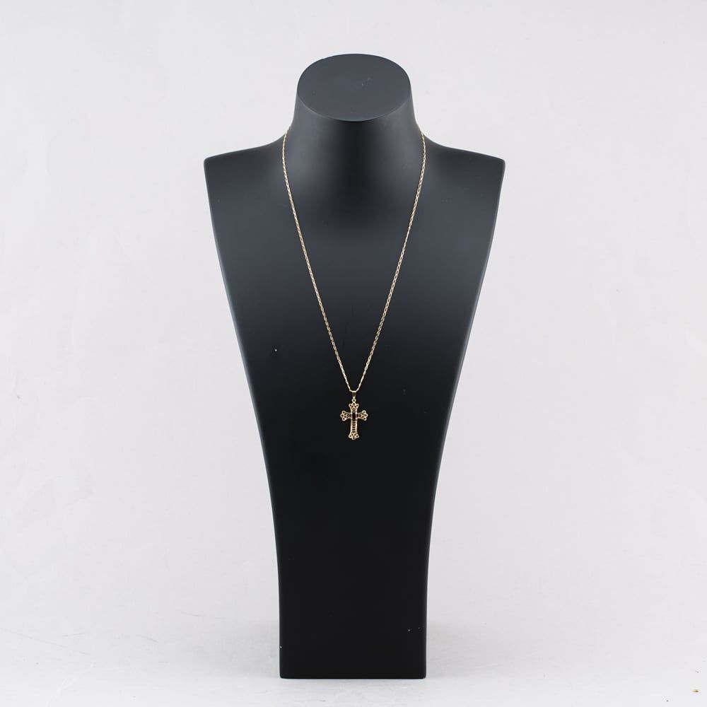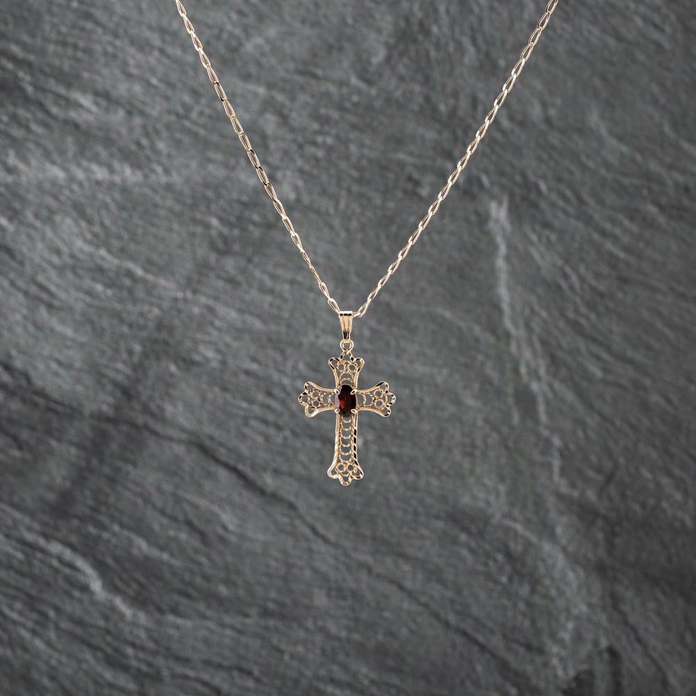 Second Hand 9ct Yellow Gold Garnet Filigree Cross Pendant & 20 Inch Curb Chain 41142921 Second Hand 9ct Yellow Gold Garnet Filigree Cross Pendant & 20 Inch Curb Chain 41142921