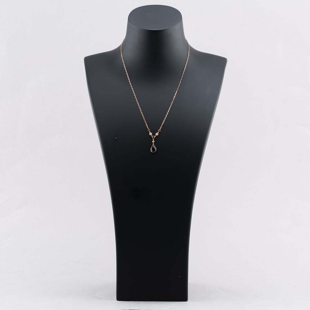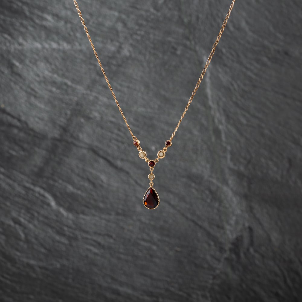 9ct Yellow Gold Garnet & Seed Pearl Pendant & 18 Inch Figaro Chain