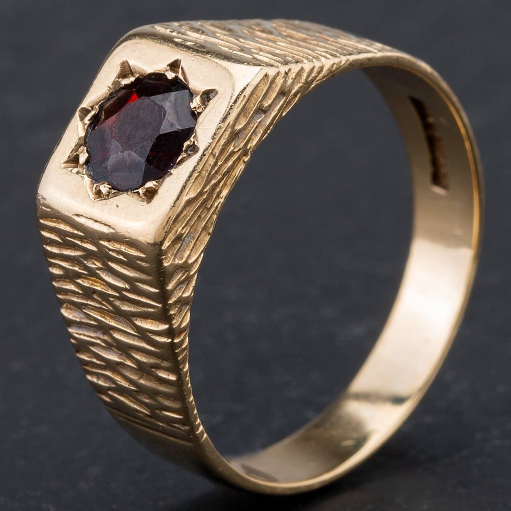 9ct Yellow Gold Gentlemans Garnet Single Stone Signet with Bark Effect Shoulders Ring