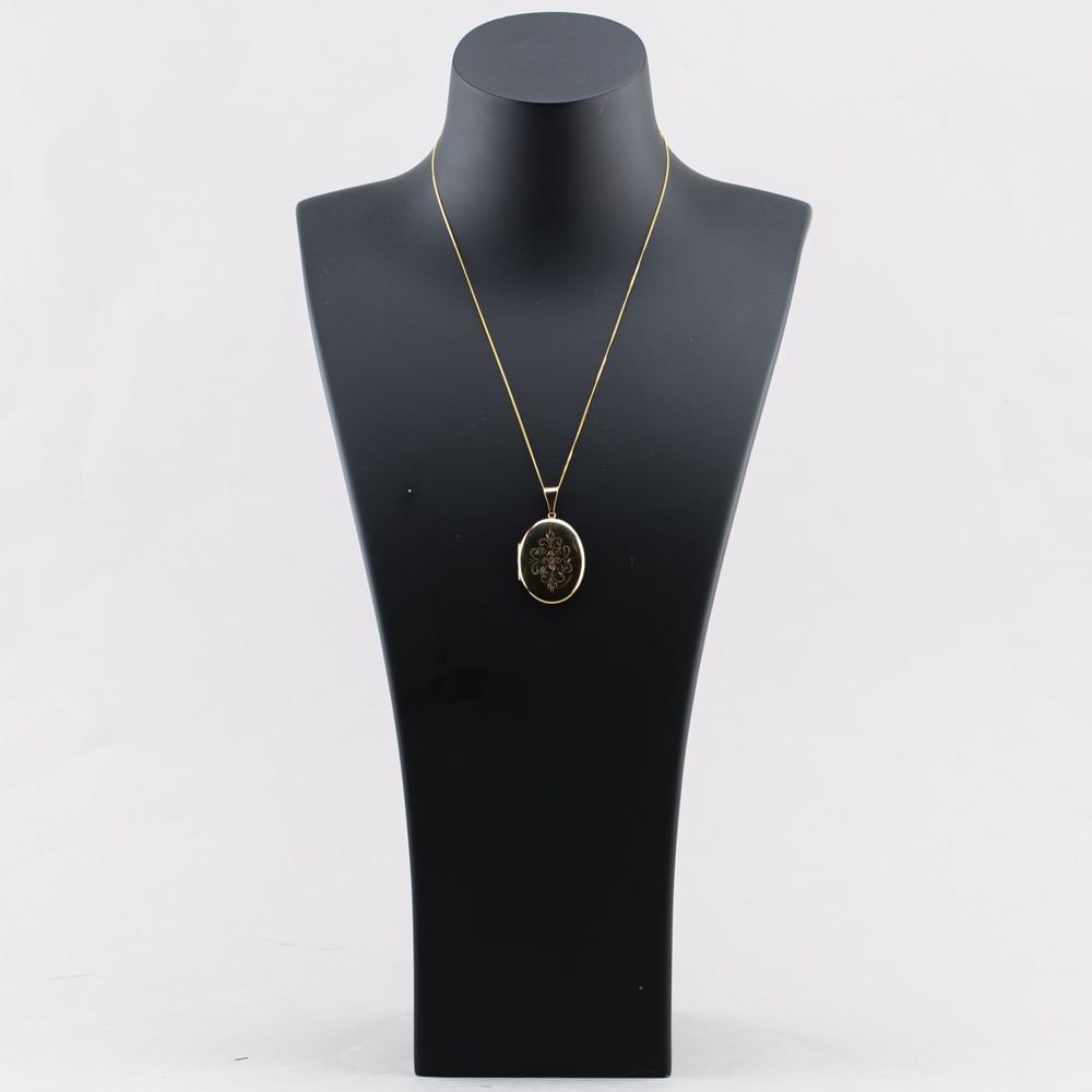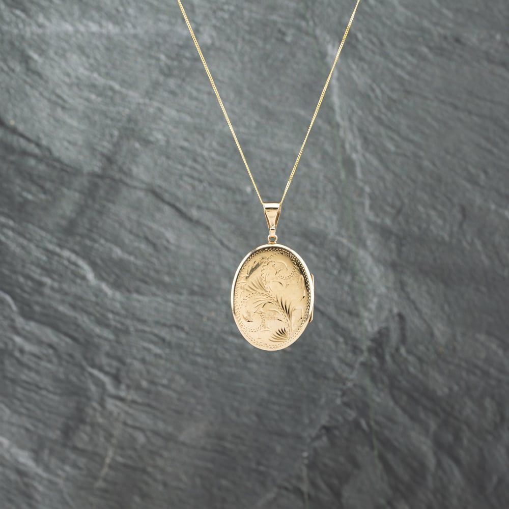 9ct Yellow Gold Hand Engraved Oval Floral Design Locket Pendant & 18 Inch Curb Chain