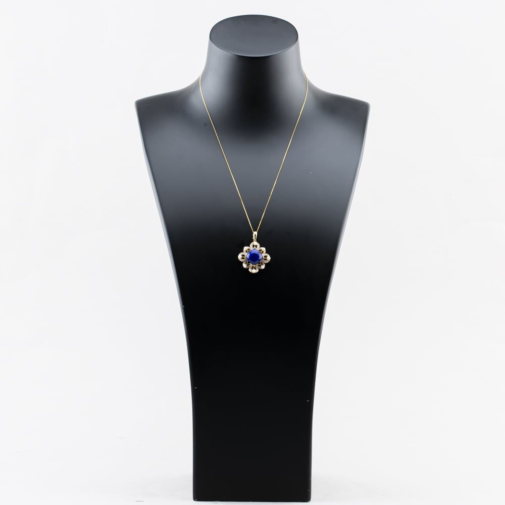 9ct Yellow Gold Lapis Lazuli & 0.12ct Diamond & Cultured Pearl Decorative Victorian Style Pendant & 18 Inch Curb Chain