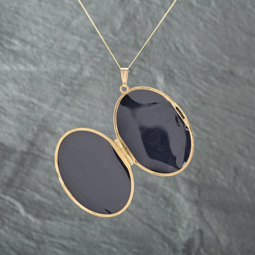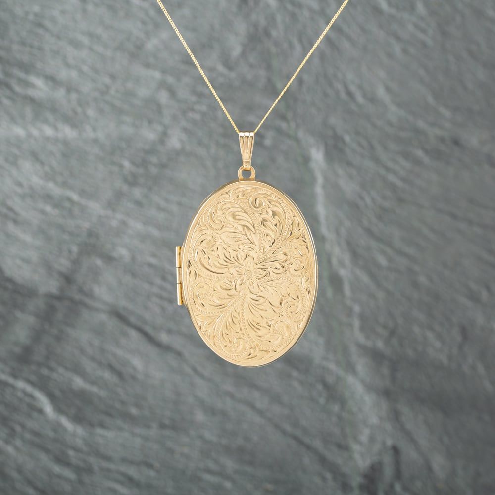 9ct Yellow Gold Large Oval Patterned Locket Pendant & 18 Inch Curb Chain