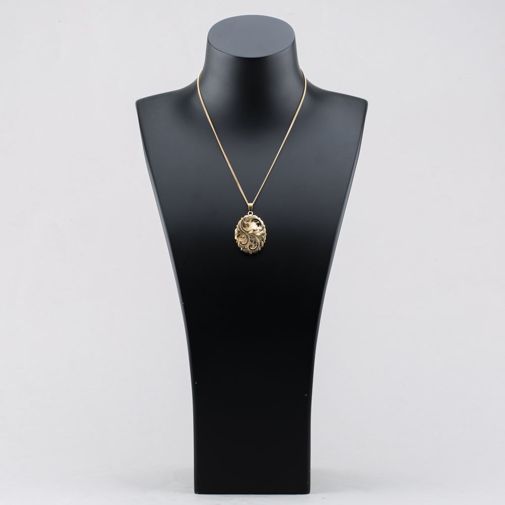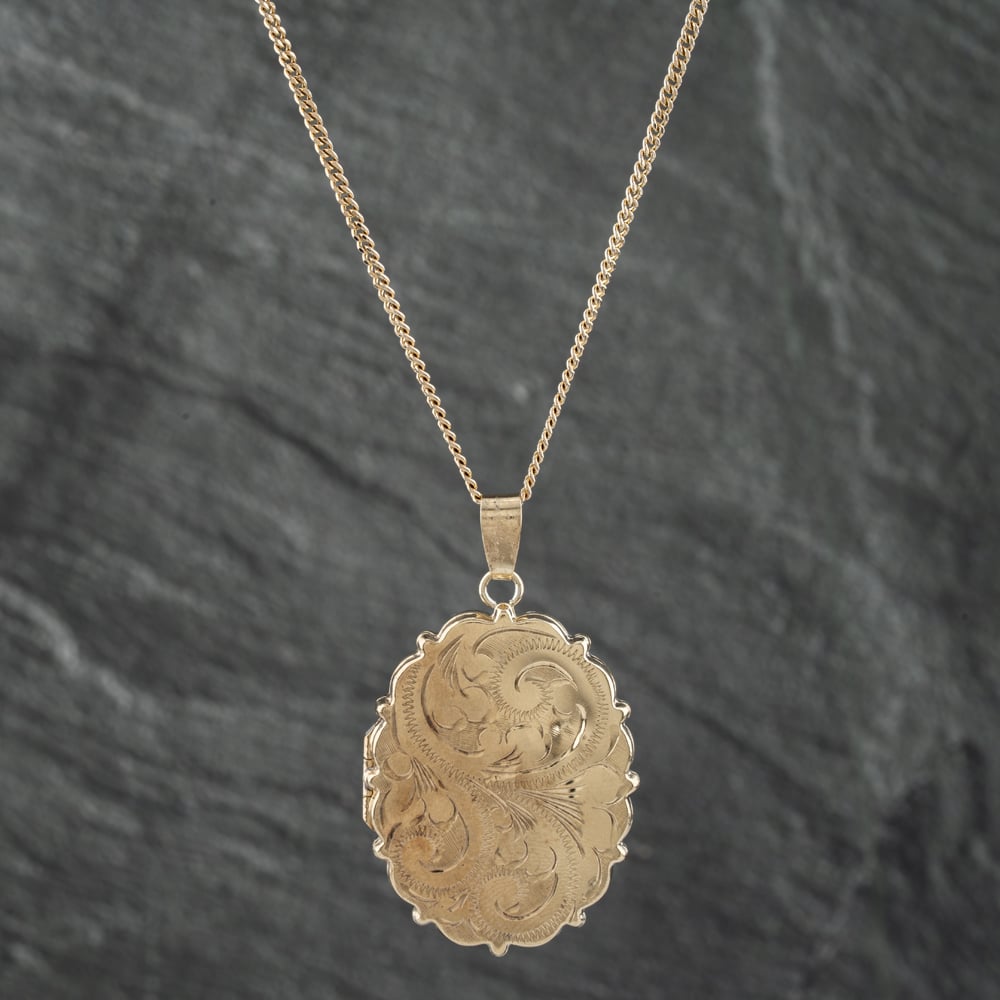 9ct Yellow Gold Large Scollop Edge Hand Engraved Locket Pendant & 16 Inch Curb Chain