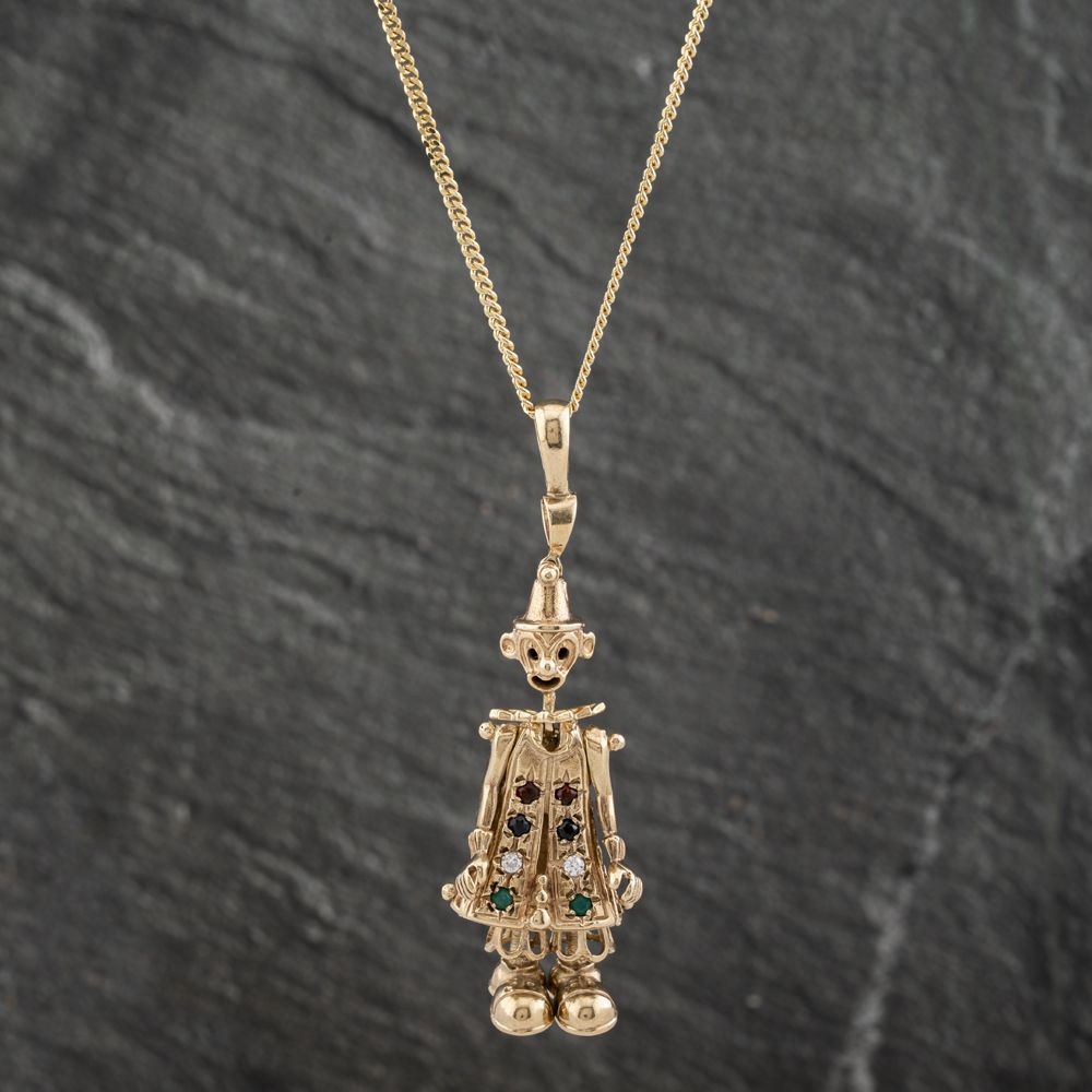 9ct Yellow Gold Multi Stone Clown Pendant & 18 Inch Curb Chain