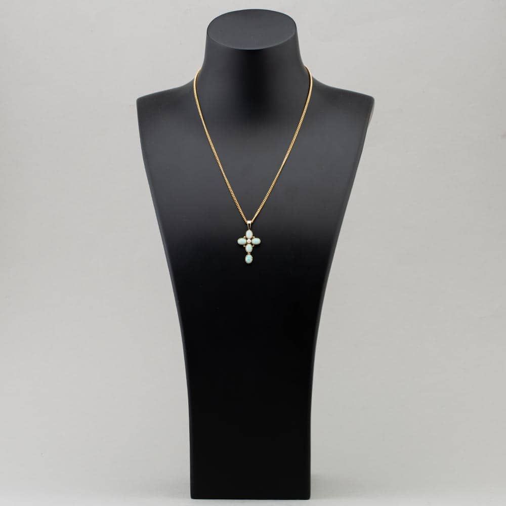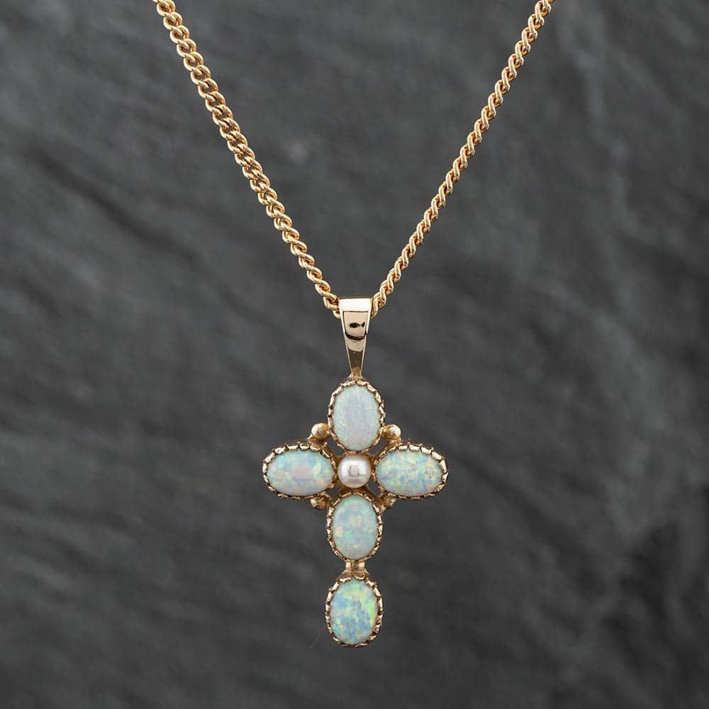 9ct Yellow Gold Opal & Cultured Pearl Cross Pendant & 18 Inch Curb Chain