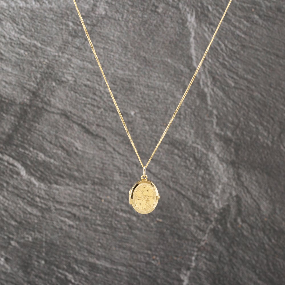 Second Hand 9ct Yellow Gold Oval Engraved Locket Pendant & 18 Inch Curb Chain 41142995 Second Hand 9ct Yellow Gold Oval Engraved Locket Pendant & 18 Inch Curb Chain 41142995