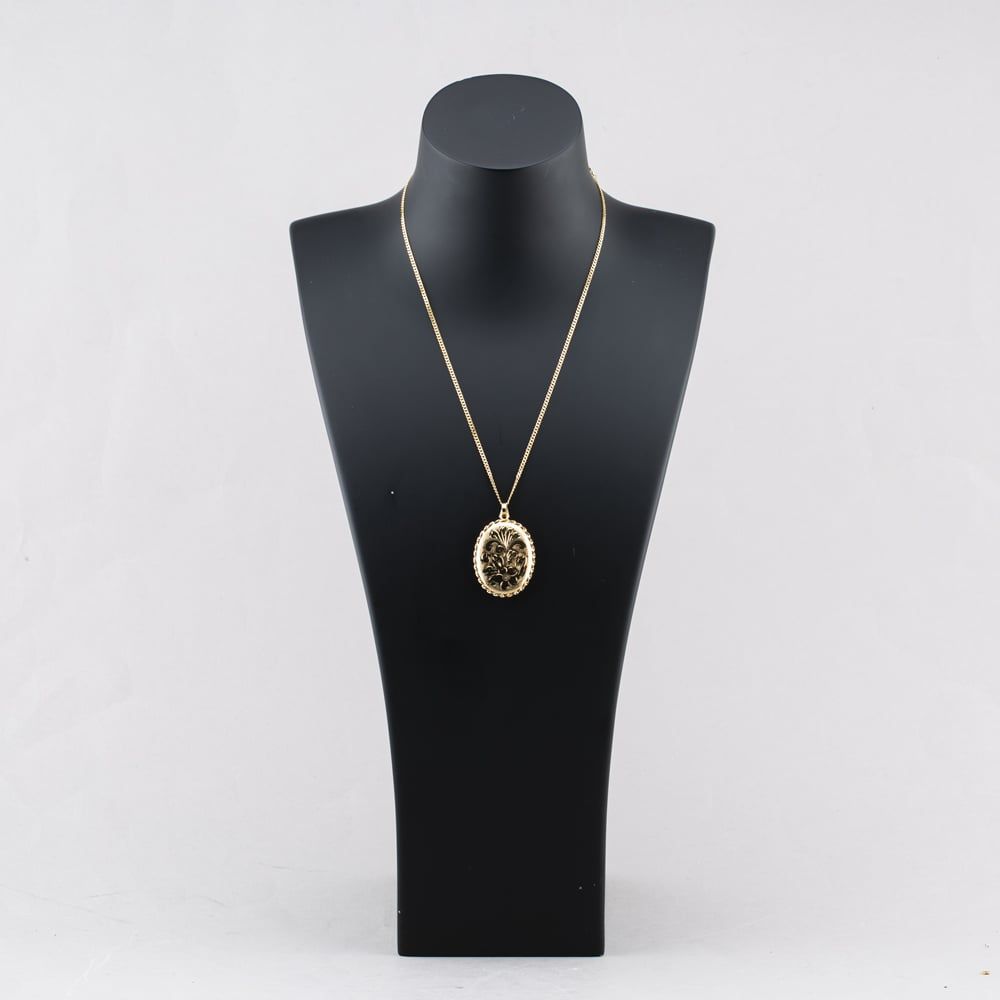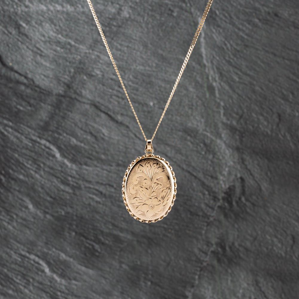 9ct Yellow Gold Oval Foliate Hand Engraved Locket Pendant & 18 Inch Curb Chain