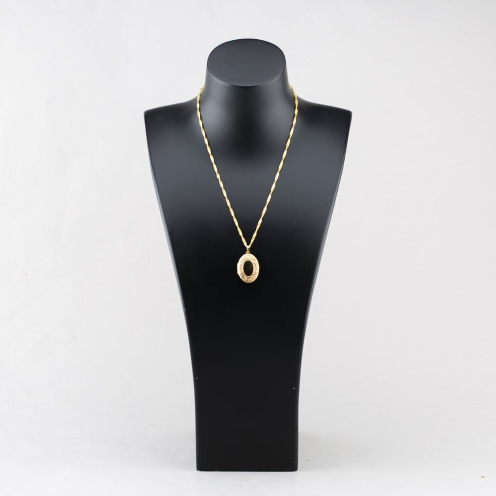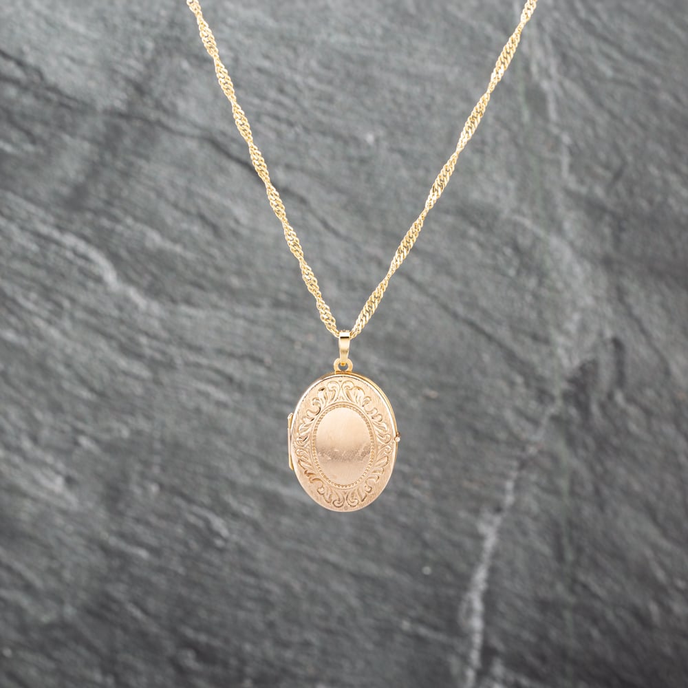 9ct Yellow Gold Oval Hand Engraved Locket Pendant & 16 Inch Curb Chain
